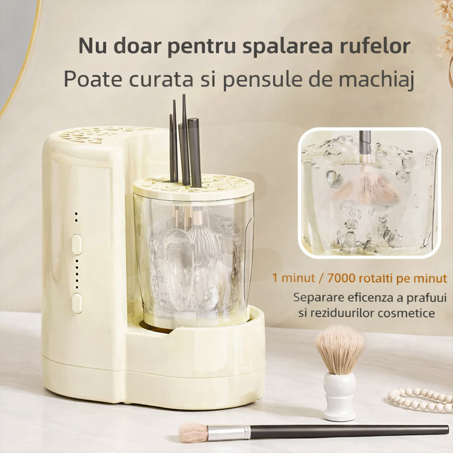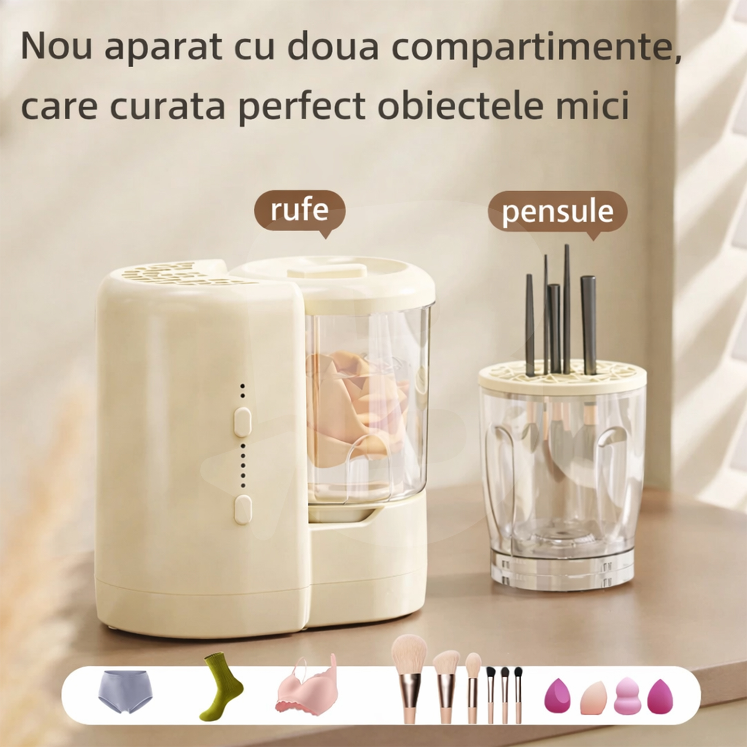 Un avantaj major al acestui produs este sistemul cu două compartimente separate, unul destinat rufelor delicate și unul special conceput pentru pensule de machiaj, bureți cosmetici și aplicatoare. Compartimentul dedicat accesoriilor de machiaj permite curățarea temeinică a reziduurilor de fond de ten, pudră, uleiuri și praf, menținând igiena și prelungind durata de viață a instrumentelor. Această funcționalitate face produsul extrem de atractiv pentru saloane cosmetice, make-up artiști și comercianți din zona beauty.