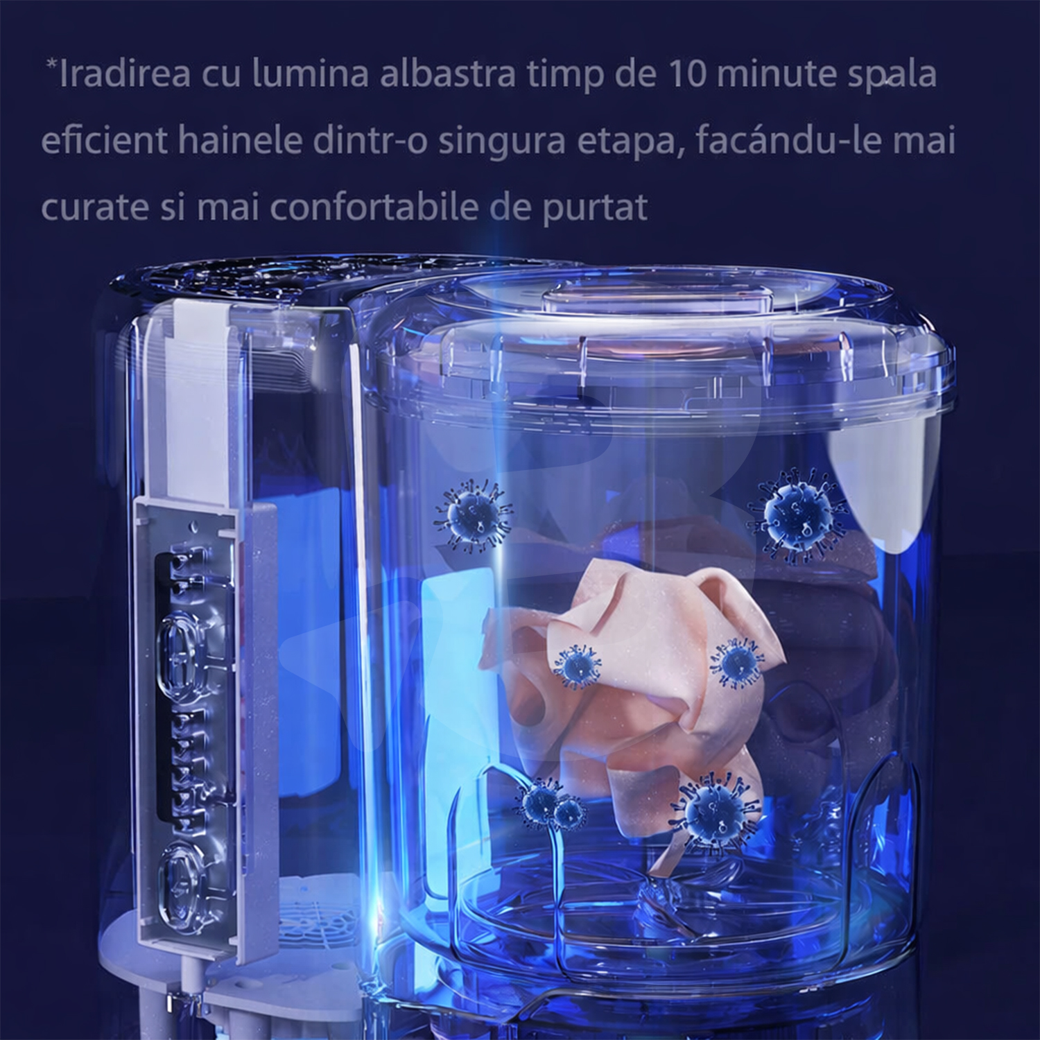 Tehnologia de iradiere cu lumină albastră contribuie la igienizarea articolelor în timpul ciclului de spălare, ajutând la eliminarea bacteriilor și a compușilor responsabili de mirosurile neplăcute. Acest lucru este deosebit de important pentru articolele purtate direct pe piele, precum lenjeria intimă sau hainele sport, unde standardele de curățare sunt ridicate.