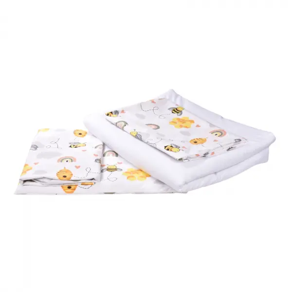 Asigurați un somn liniștit și confortabil celor mici cu acest set complet lenjerie 5 piese pentru pătuț stivuibil grădiniță, special conceput pentru a răspunde nevoilor specifice din creșe, grădinițe și centre after-school. Modelul vesel cu albinuțe aduce un plus de energie și culoare în sala de grupă, creând un mediu primitor și relaxant, ideal pentru odihna de după-amiază. Designul este adaptat perfect pentru pătuțurile stivuibile standard, oferind o fixare sigură și un aspect îngrijit.