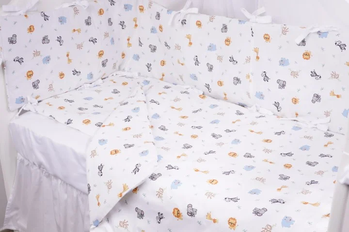Transformați ora de odihnă într-o călătorie plină de imaginație cu acest set complet lenjerie 5 piese pentru pătuț stivuibil, decorat cu un model vesel cu animăluțe safari. Leii curajoși, girafele delicate și elefănțeii simpatici creează o lume plină de poveste chiar în pătuțul micului explorator. Acest design nu doar înfrumusețează sala de grupă din grădiniță sau creșă, ci transformă culcușul într-un spațiu primitor și cald, ideal pentru momentele de relaxare.