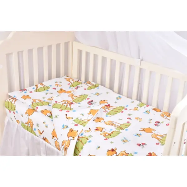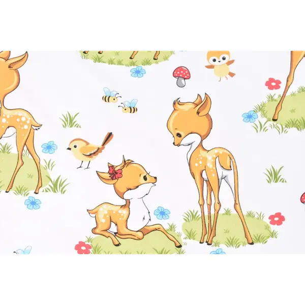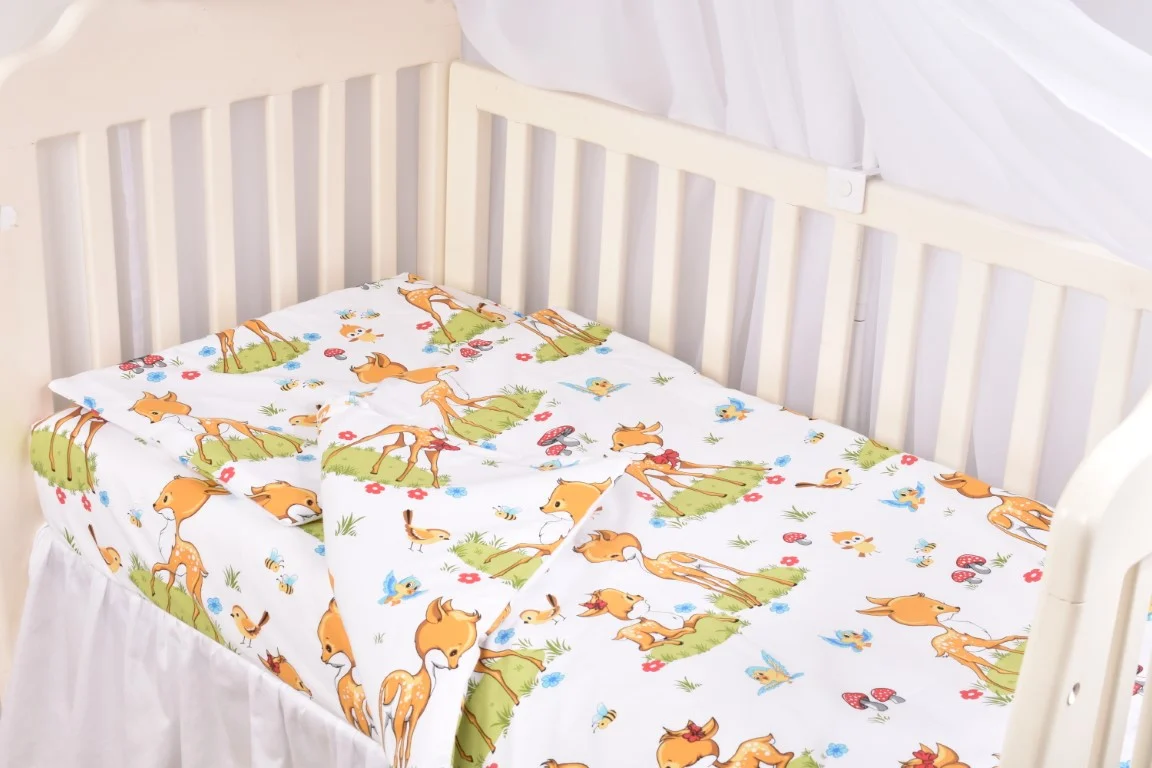Creați un colț de poveste inspirat din natură cu acest set complet lenjerie 5 piese pentru pătuț stivuibil grădiniță, decorat cu un model delicat cu căprioare. Acest set premium este conceput special pentru a oferi micuților din creșe și grădinițe un somn odihnitor într-un mediu calm și relaxant. Imprimeul blând cu motive de pădure transformă ora de somn într-o experiență plăcută, oferind în același timp un aspect estetic deosebit sălii de grupă.