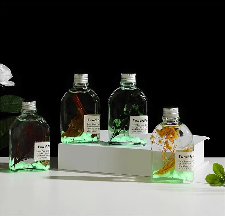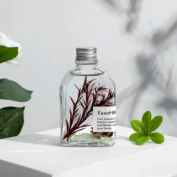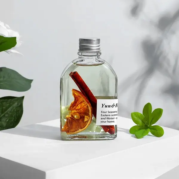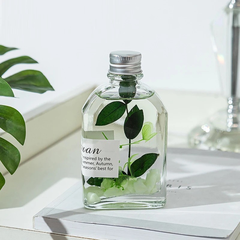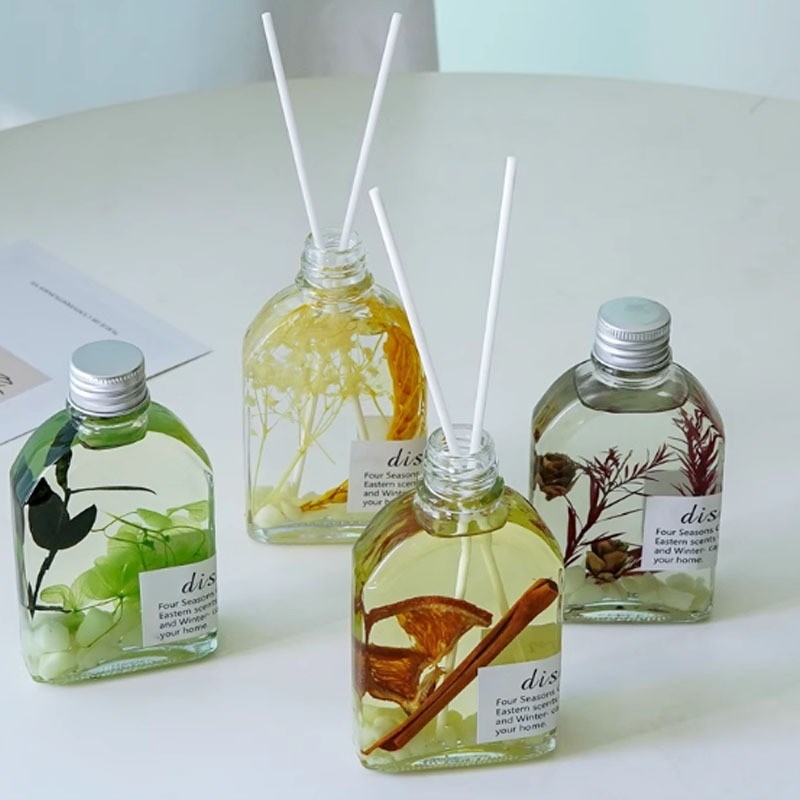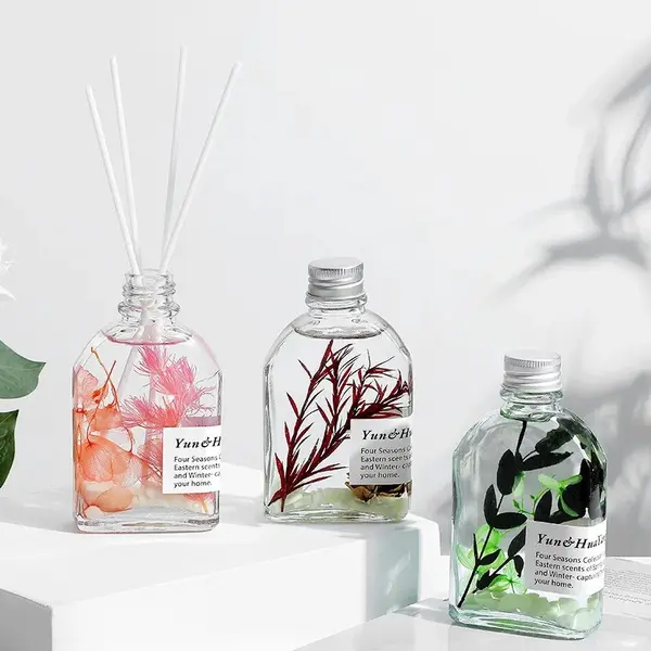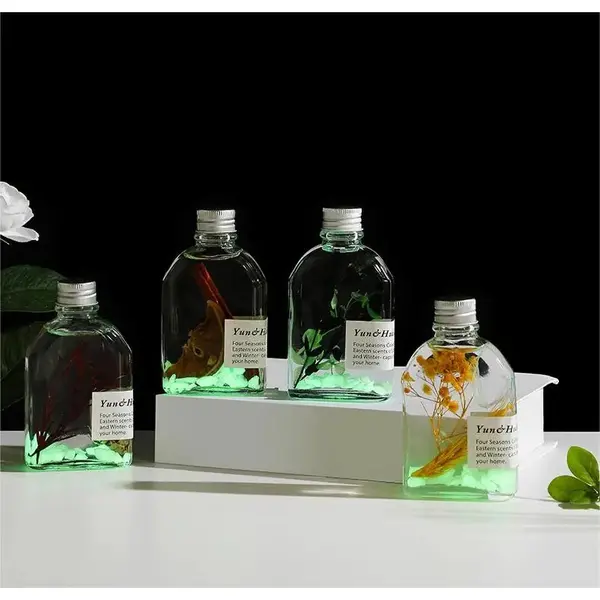 Fiecare odorizant este prezentat într-un recipient din sticlă transparentă, cu design minimalist și modern, ce permite vizualizarea conținutului și a elementelor decorative din interior. Conform imaginilor, lichidul este limpede și conține inserții decorative naturale, precum frunze, plante aromatice, citrice uscate sau alte elemente botanice, care contribuie atât la aspectul estetic, cât și la experiența olfactivă. Acest detaliu face ca produsul să poată fi expus vizibil în orice încăpere, fără a necesita mascarea lui.
