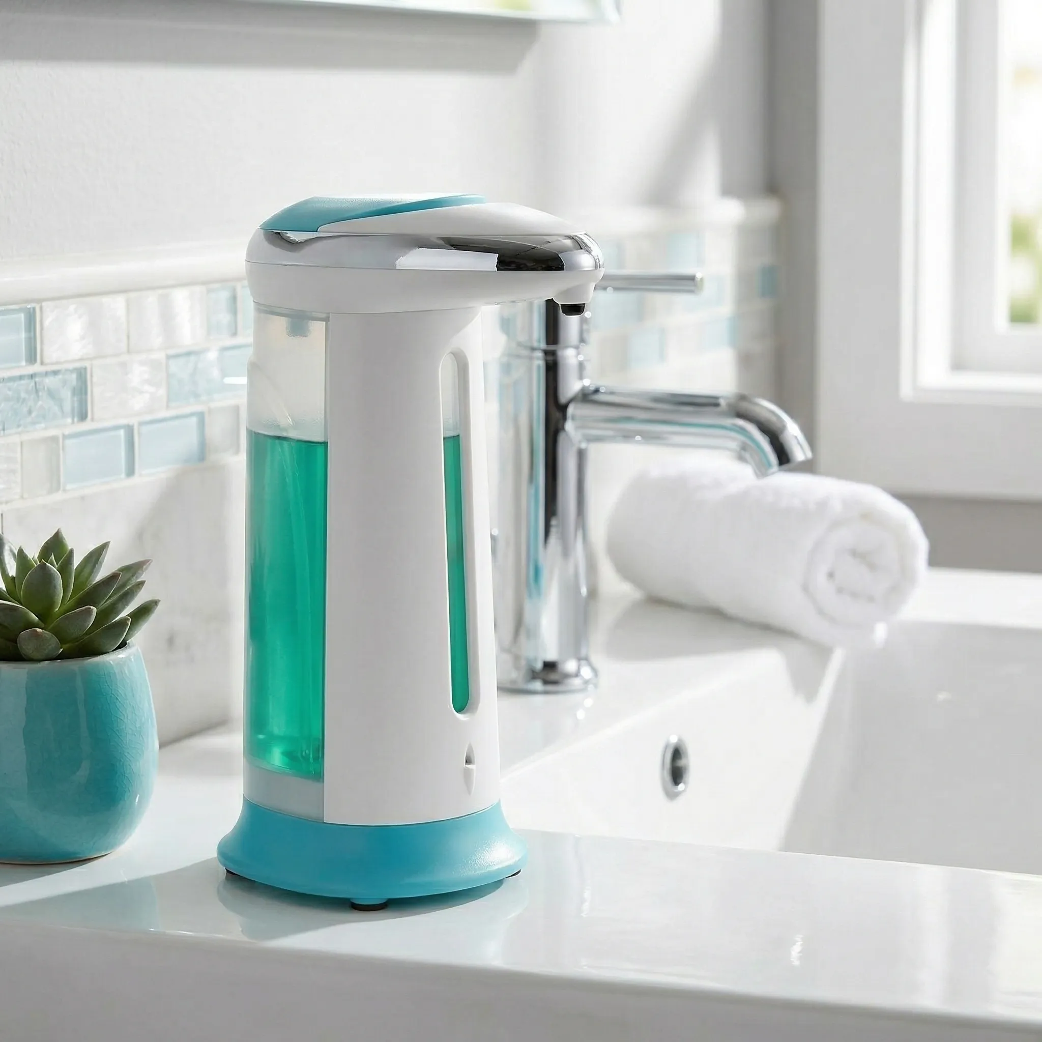 Tehnologie Touchless (Fără Atingere) Datorită senzorului infraroșu integrat, nu mai este nevoie să apeși pe butoane cu mâinile murdare. Pur și simplu plasezi mâna sub dozator, iar acesta va elibera doza perfectă de lichid în fracțiuni de secundă. Această metodă previne contaminarea încrucișată și păstrează zona chiuvetei mult mai curată.