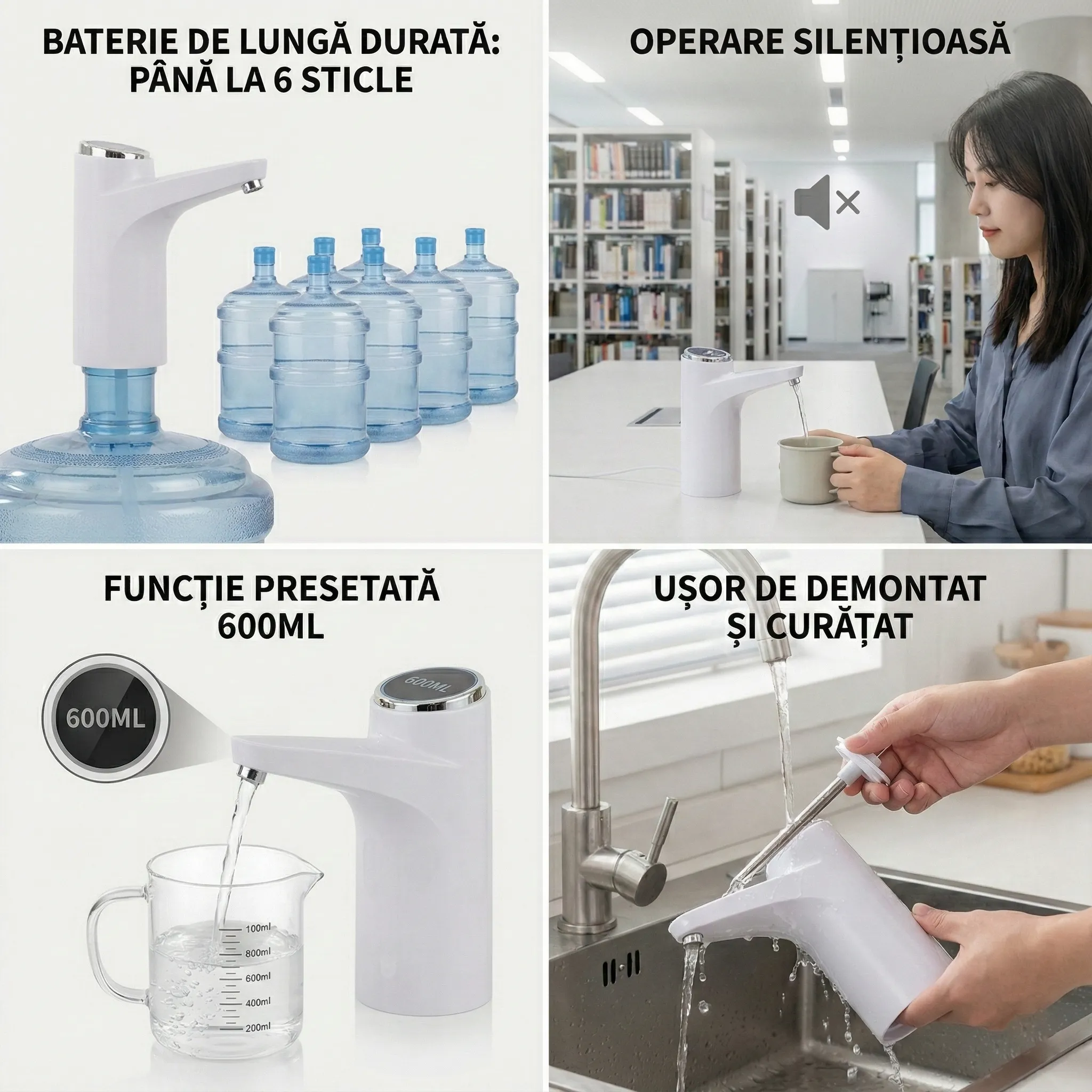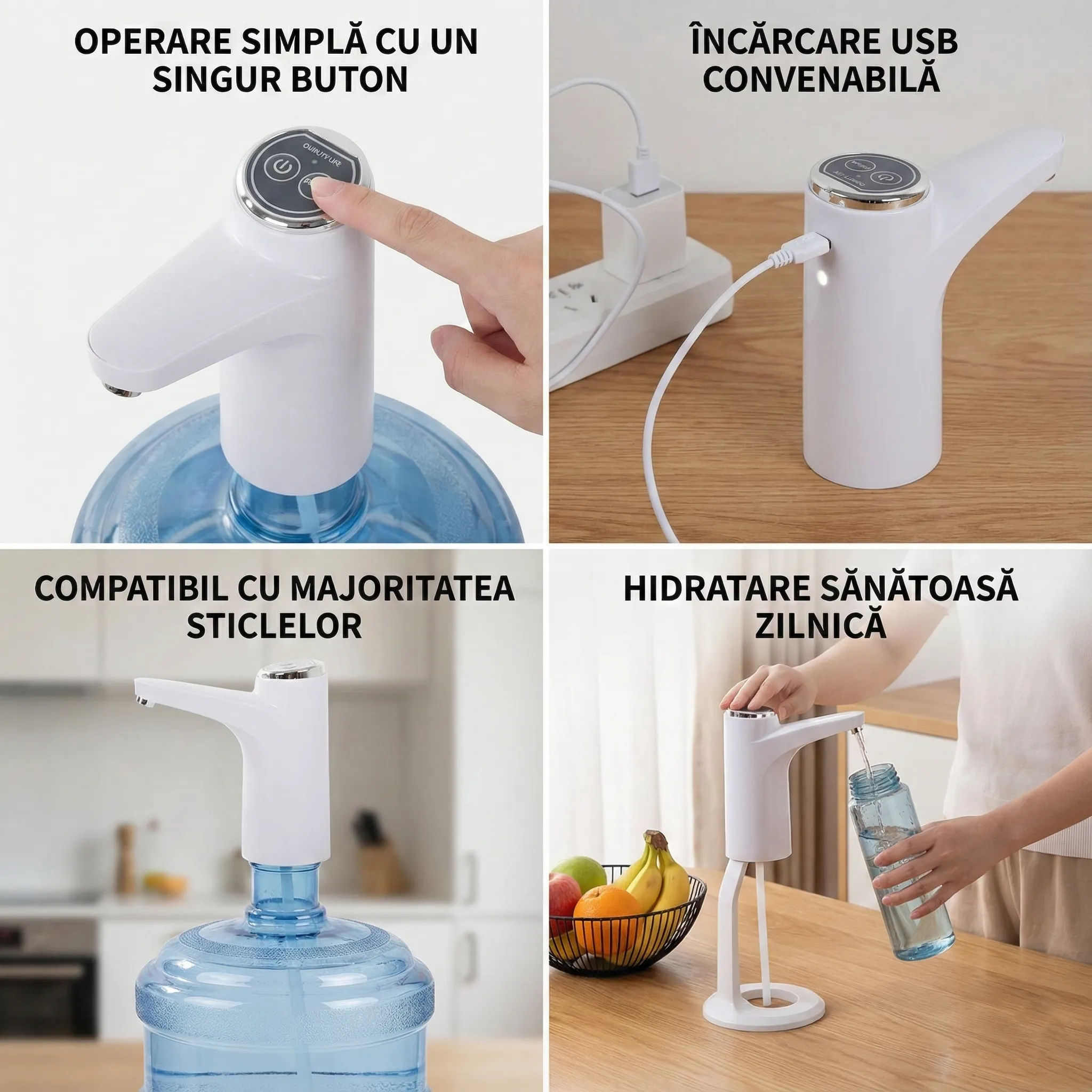 Te-ai săturat să manevrezi bidoane grele de apă sau să folosești pompe manuale ineficiente? Dozatorul Electric Reîncărcabil îți simplifică viața instantaneu. Designul său compact și elegant se montează în câteva secunde pe gura bidonului, eliminând vărsarea apei și efortul fizic.