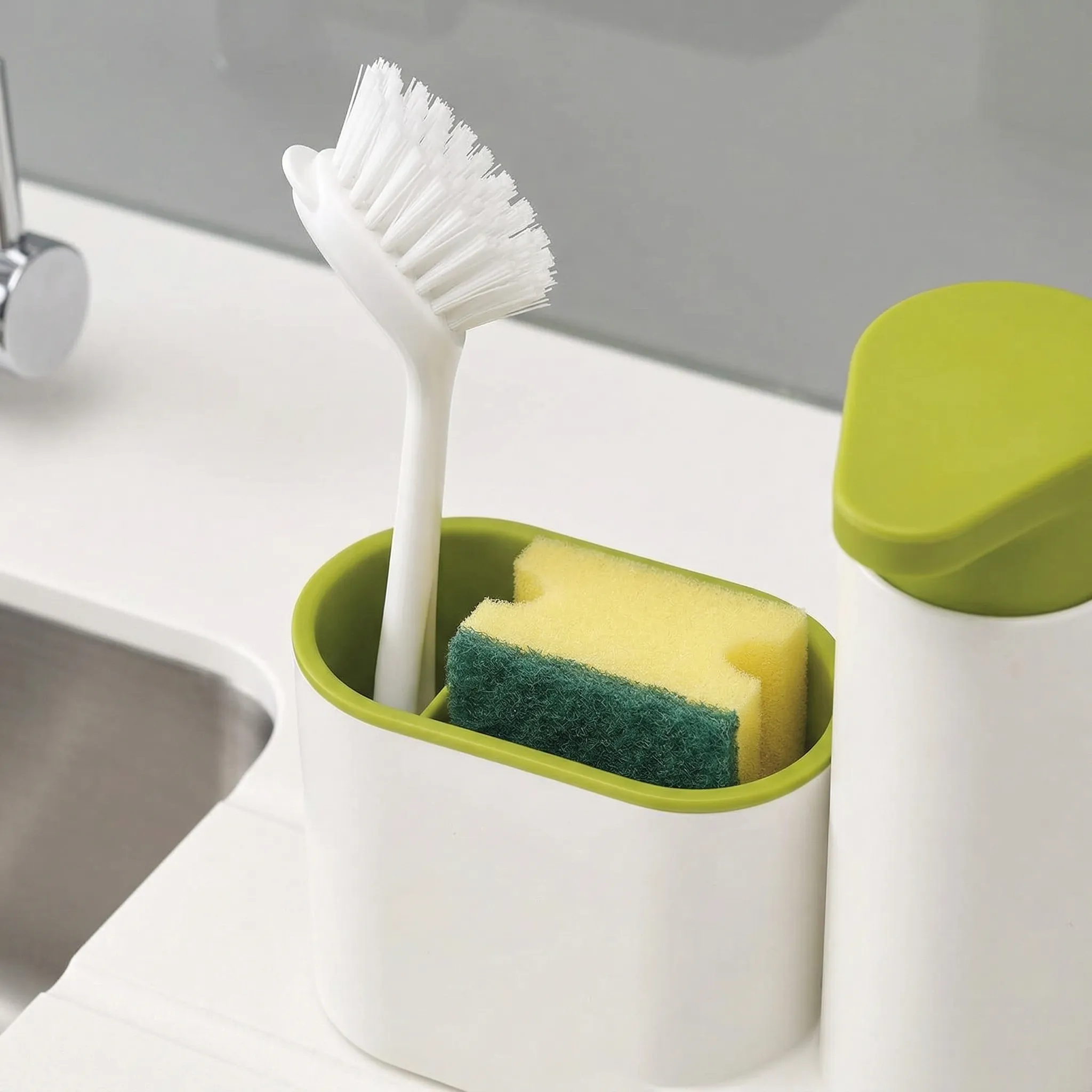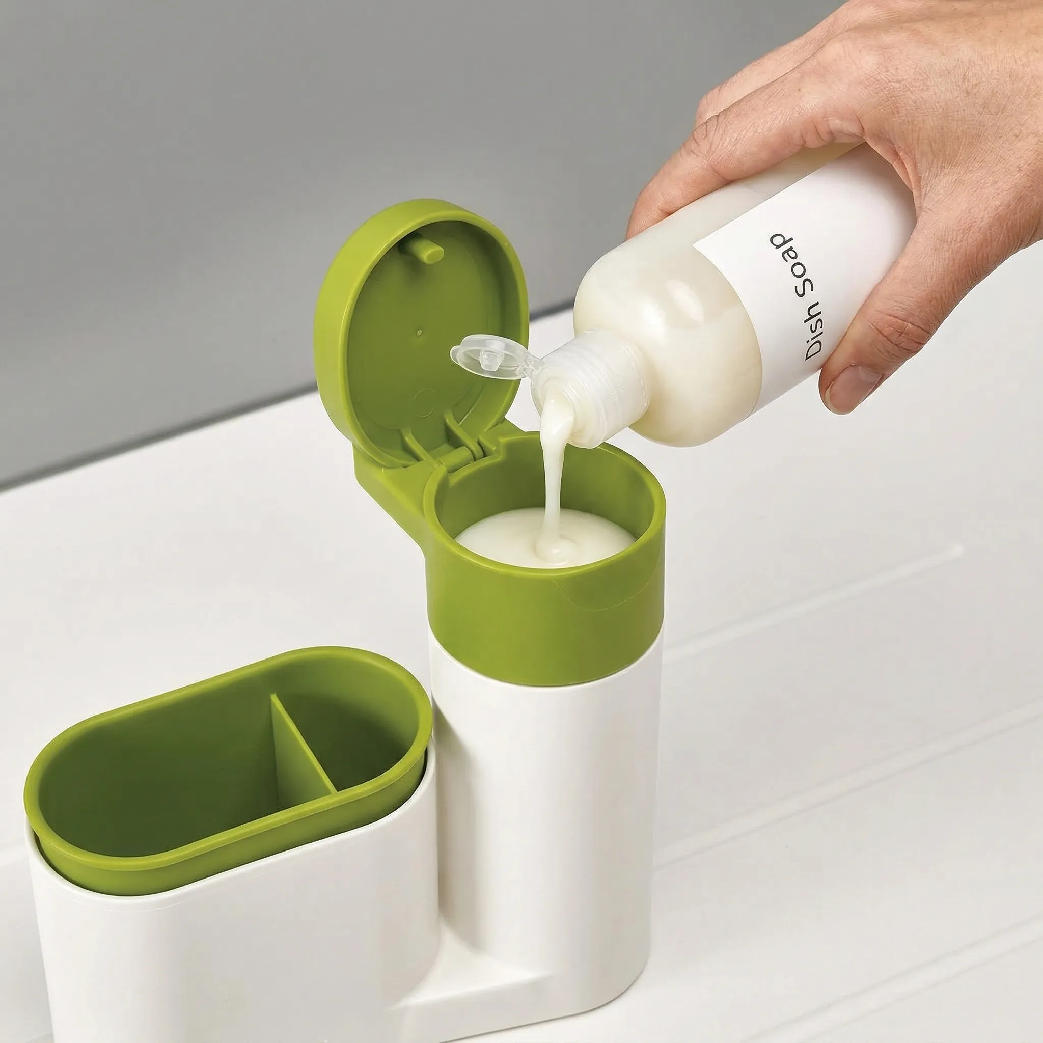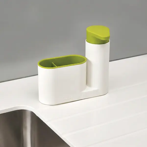 - Multifuncționalitate: Dispenser de săpun și suport de burete într-un singur obiect.