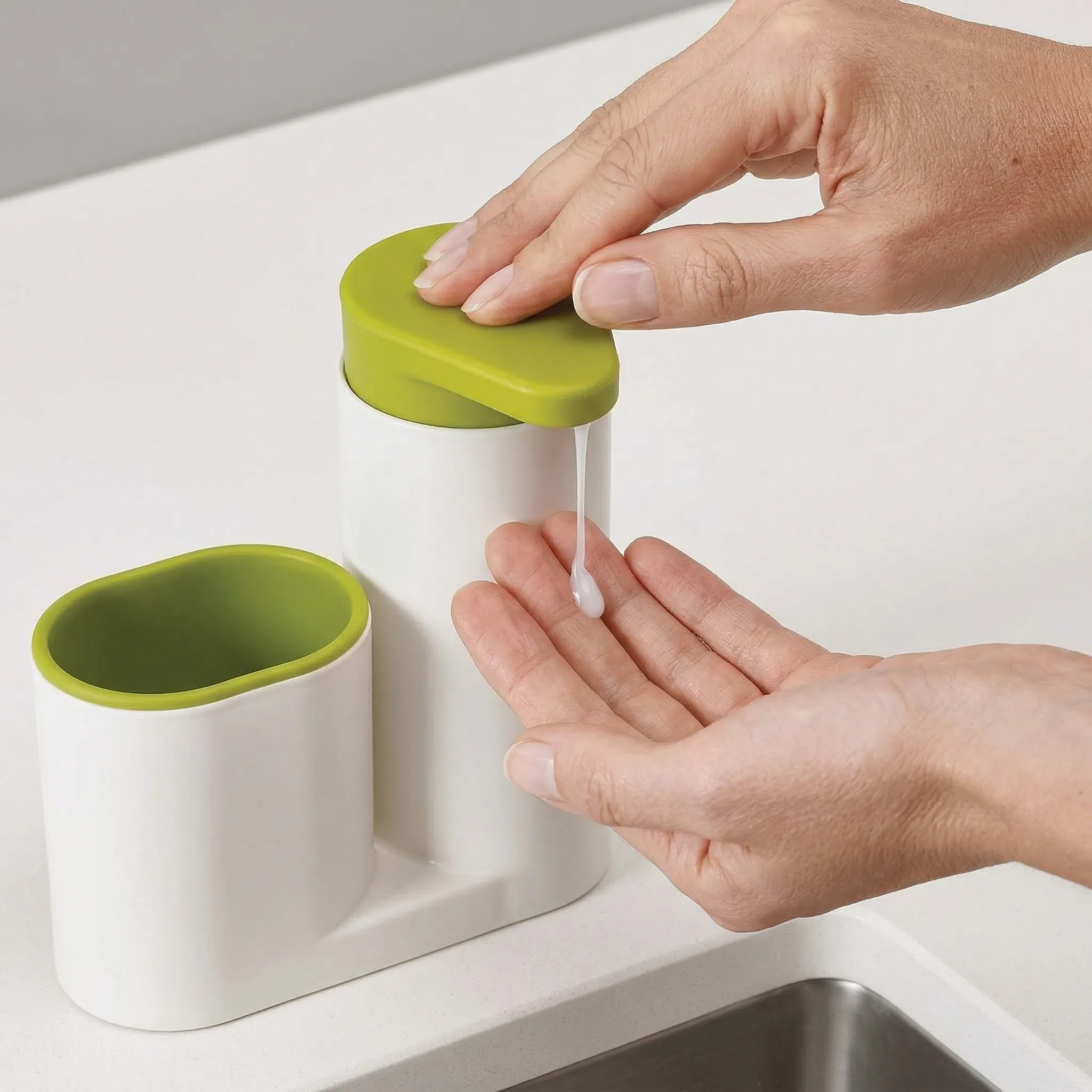 Organizare Eficientă și Igienă Sporită Acest set a fost conceput special pentru a maximiza spațiul din jurul chiuvetei, fiind perfect atât pentru bucătăriile mari, cât și pentru cele de dimensiuni reduse. Dispenserul integrat îți permite să ai mereu la îndemână cantitatea optimă de săpun lichid, în timp ce suportul dedicat pentru burete asigură o uscare rapidă și igienică a acestuia, prevenind acumularea umidității și a mirosurilor neplăcute.