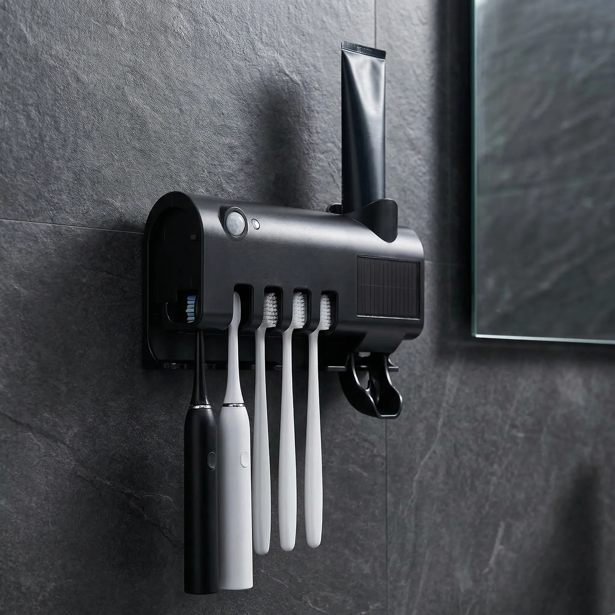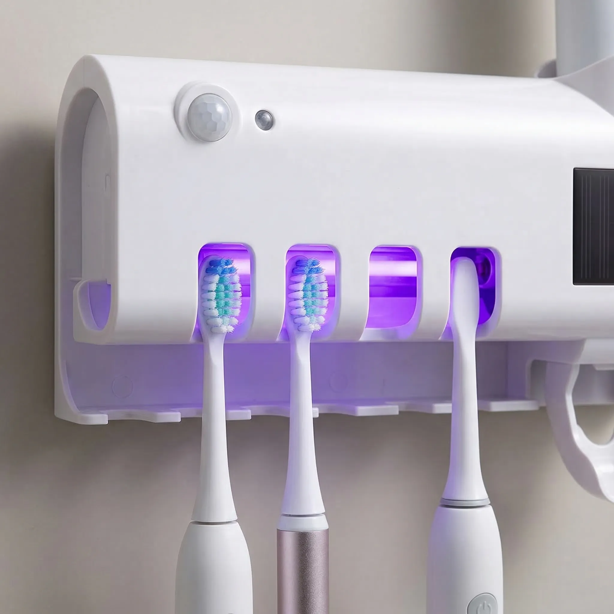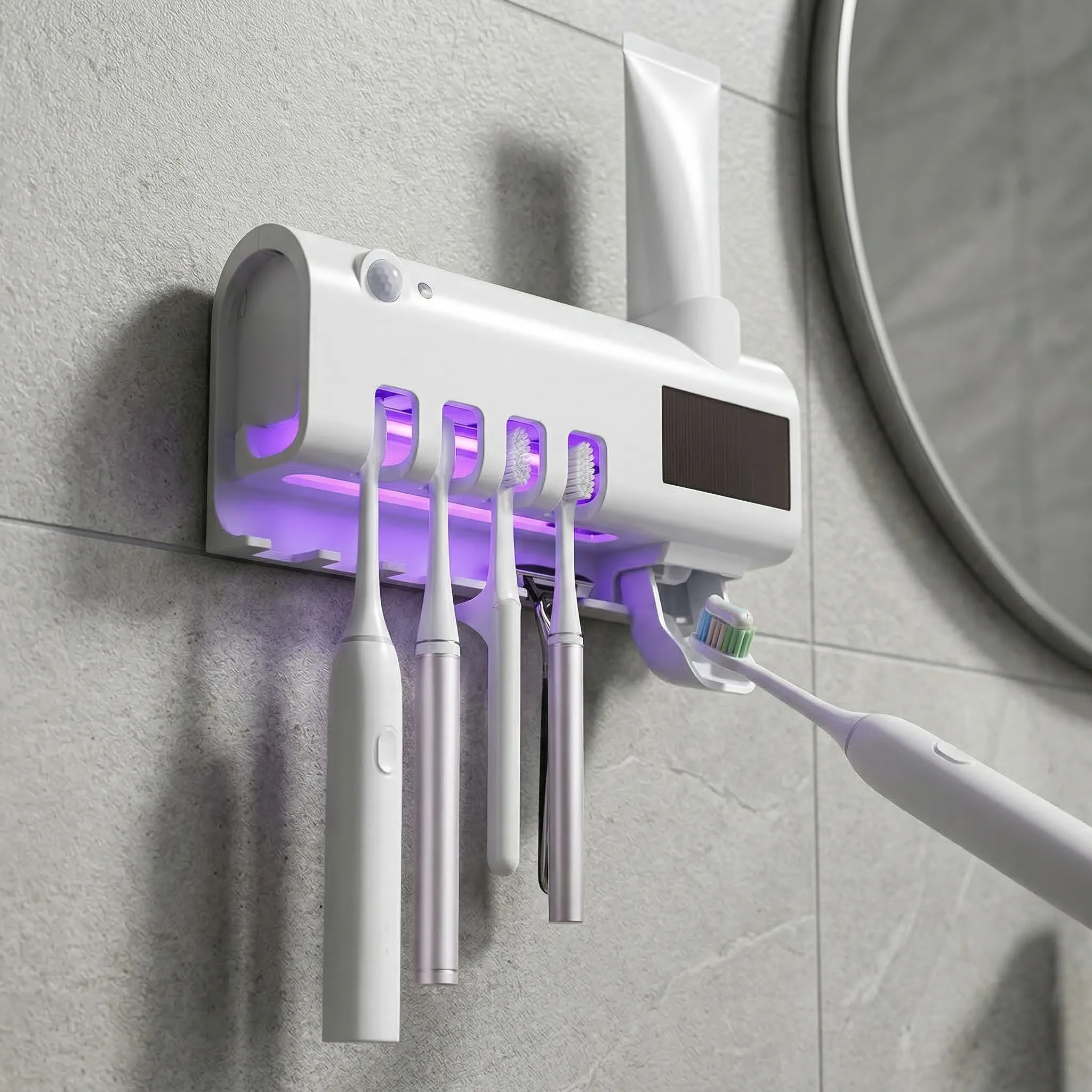 Transformă rutina zilnică de îngrijire într-o experiență sigură și igienică cu Suportul cu Sterilizator UV și Dozator de Pastă de Dinți – bariera ta împotriva bacteriilor!