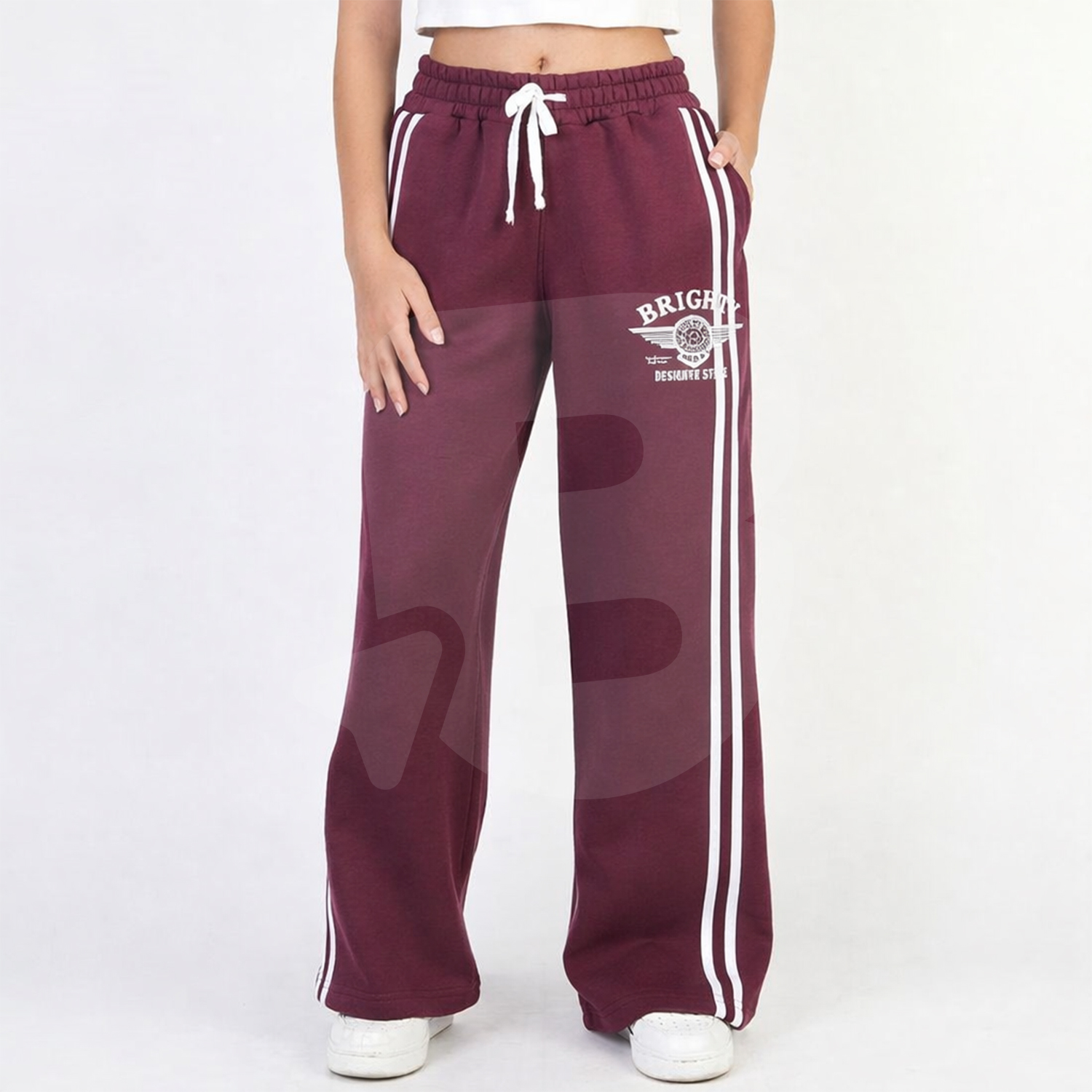 Designul sport-casual este pus în valoare de două dungi albe verticale pe lateral, care conferă un aspect dinamic și actual. Imprimeul cu text aplicat pe partea frontală adaugă personalitate și stil, fiind potrivit pentru ținute de zi cu zi, școală sau activități recreative. Culoarea bordo este practică, ușor de asortat și foarte apreciată în colecțiile pentru fete.