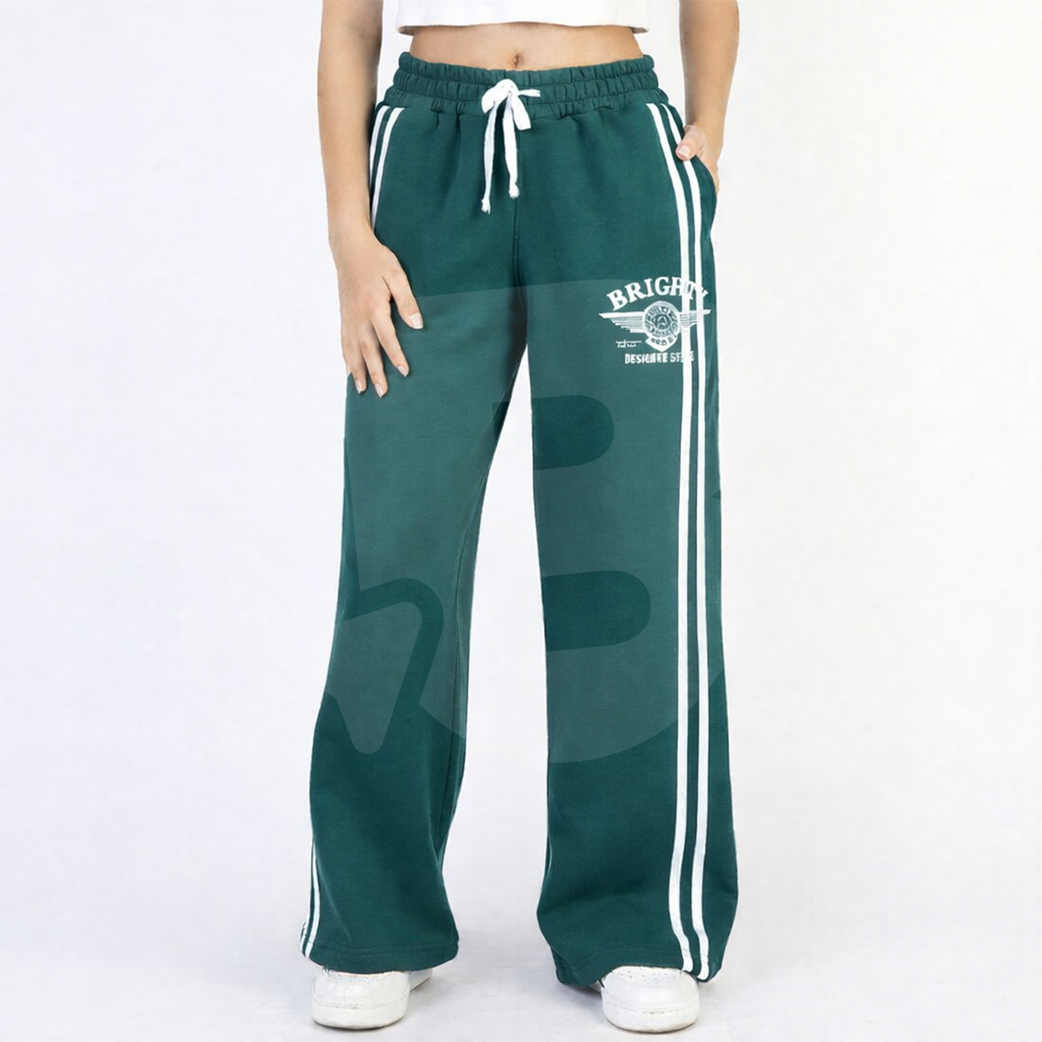 Designul sport-casual este pus în valoare de două dungi albe verticale pe lateral, care conferă un aspect dinamic și actual. Imprimeul cu text aplicat pe partea frontală adaugă personalitate și stil, fiind potrivit pentru ținute de zi cu zi, școală sau activități recreative. Culoarea verde închis este practică, ușor de asortat și foarte apreciată în colecțiile pentru fete.
