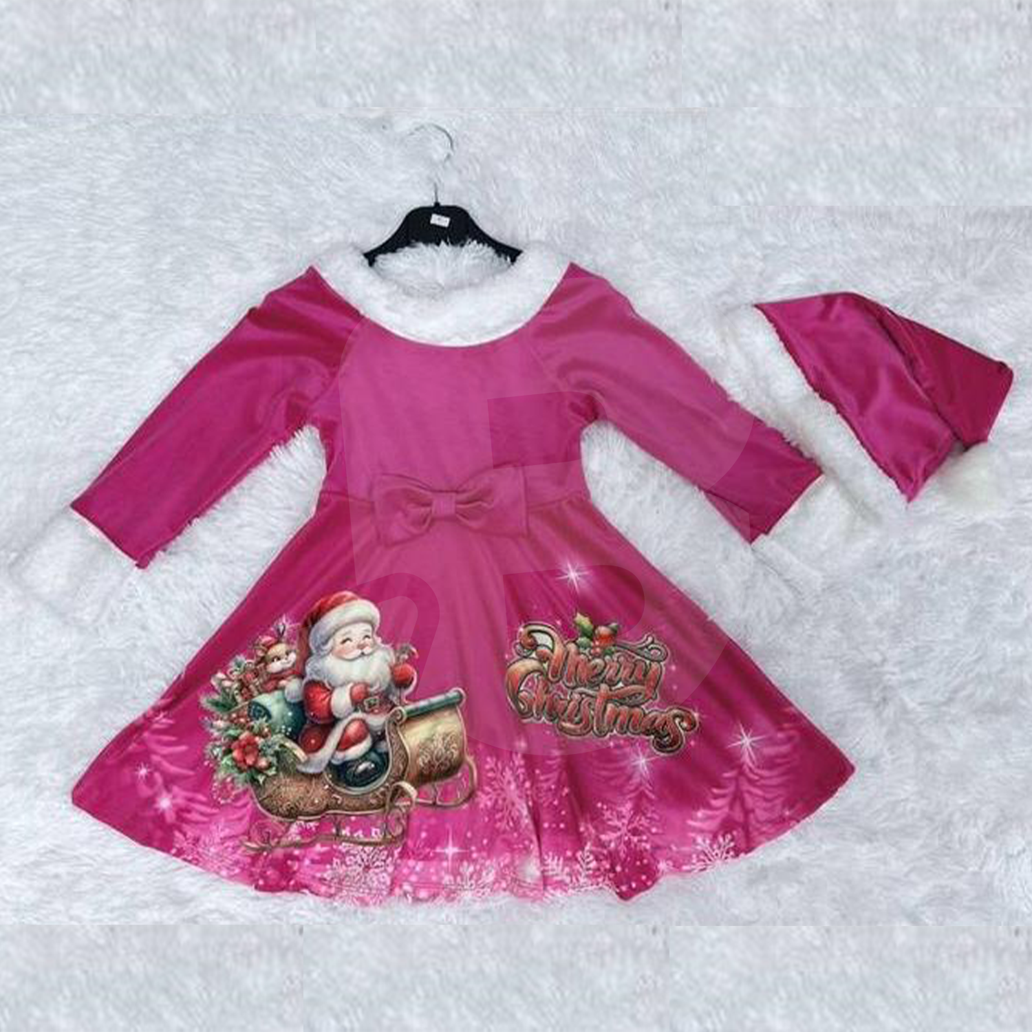 Fiecare rochiță este dotată cu guler și manșete din blăniță albă, oferind un aspect autentic, perfect pentru evenimentele tematice de iarnă. Talia este accesorizată cu o fundă mare decorativă, ceea ce conferă ținutei un aer elegant. În partea frontală, rochițele prezintă un imprimeu detaliat și plin de culoare cu Moș Crăciun în sanie, cadouri, crenguțe decorative și mesajul festiv „Merry Christmas”. Fundalul degrade cu fulgi de zăpadă este diferit în funcție de culoare, dar la fel de spectaculos în toate variantele.