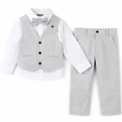 Set de 4 costume elegante pentru bebeluși băieți 6–18 luni, cu body tip cămașă, vestă gri, papion și pantaloni.
