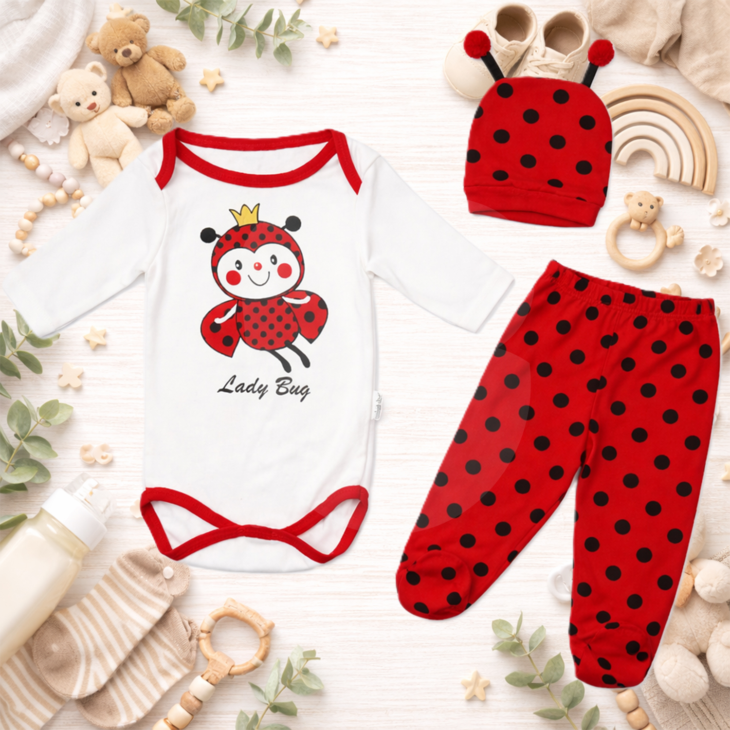 Compleul pentru bebeluși din bumbac Lady Bug, set de 2 bucăți, este un produs destinat comercializării en-gros, conceput pentru bebeluși cu vârste cuprinse între 3 și 6 luni. Setul este potrivit pentru magazine de articole pentru bebeluși, distribuitori și comercianți care doresc să includă în ofertă articole textile practice, confortabile și atractive vizual.