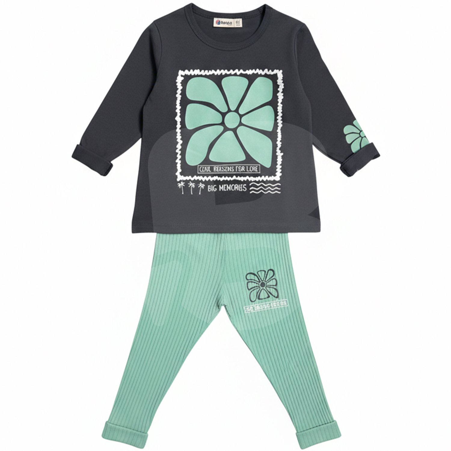 Bluza este realizată în culoare gri antracit, cu croială lejeră și imprimeu frontal decorativ cu motiv floral stilizat, în nuanță verde mentă, încadrat într-un chenar contrastant. Designul este modern, ușor de integrat în colecții casual pentru copii, iar manșetele sunt finisate atent pentru confort sporit. Materialul este subțire, elastic și respirabil, potrivit pentru purtare îndelungată.