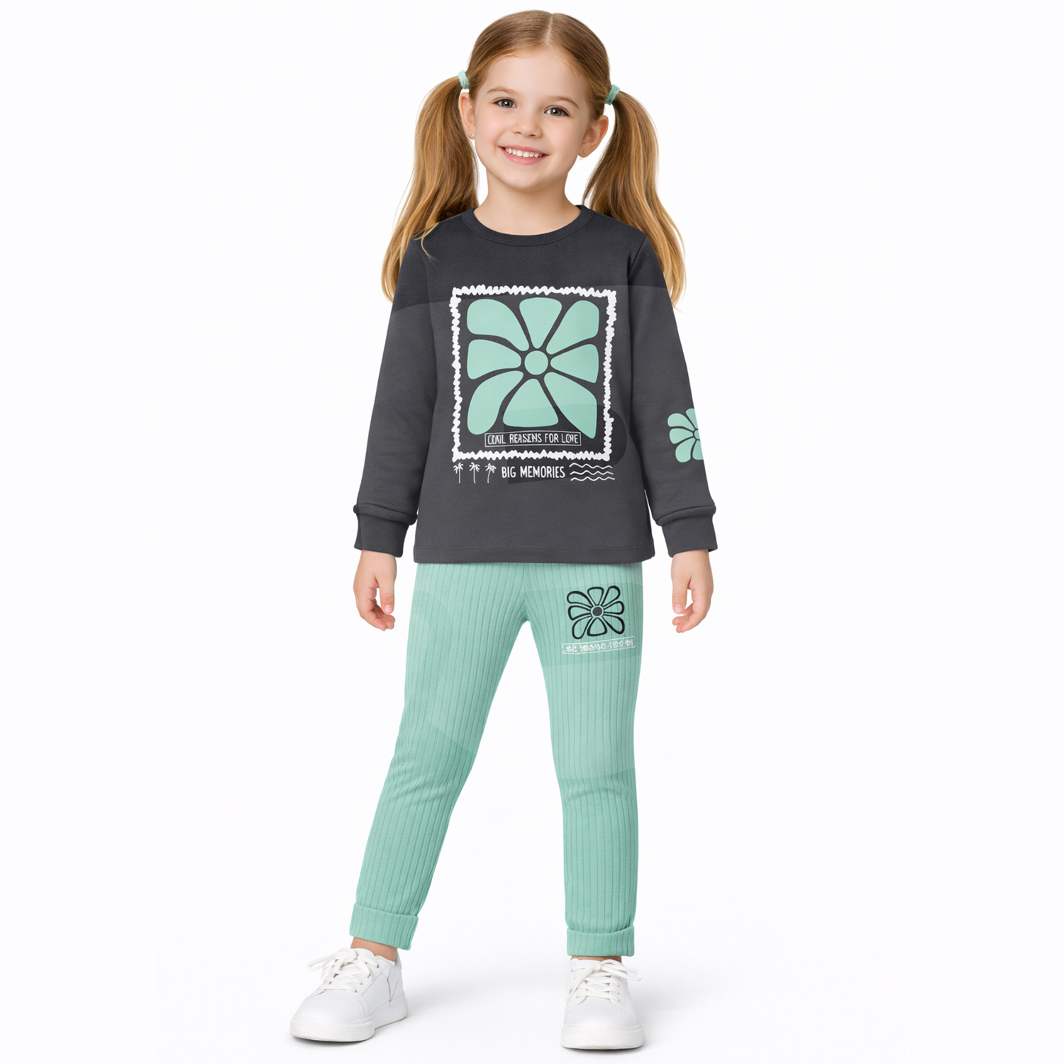 Pantalonii sunt în culoare verde mentă, cu textură striată, talie elastică și croială dreaptă, oferind libertate de mișcare. Imprimeul discret lateral completează vizual bluza, rezultând un set armonios și atractiv pentru categoria de vârstă 3–10 ani. Lungimea pantalonilor este adaptată pentru purtare zilnică, atât la interior, cât și la exterior.