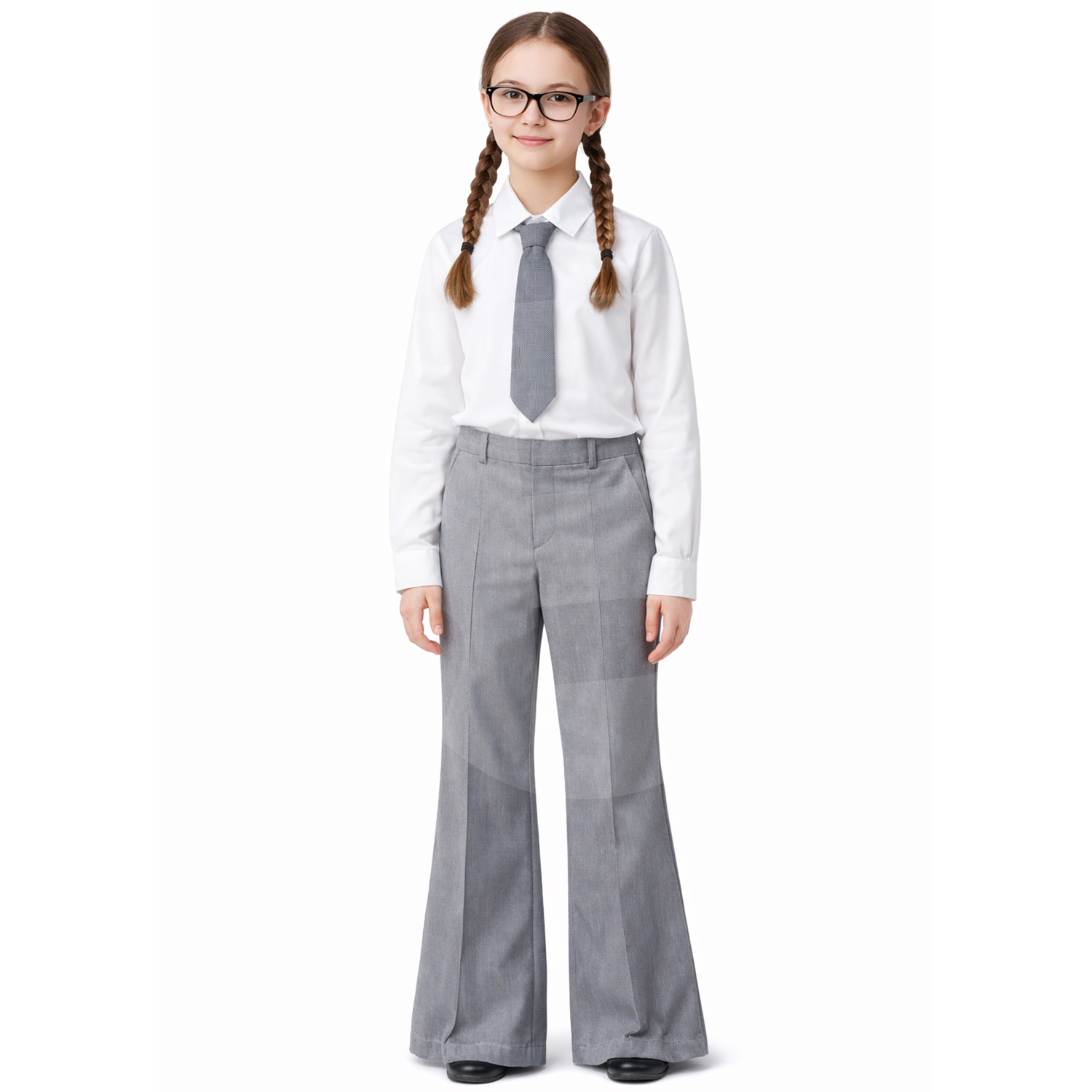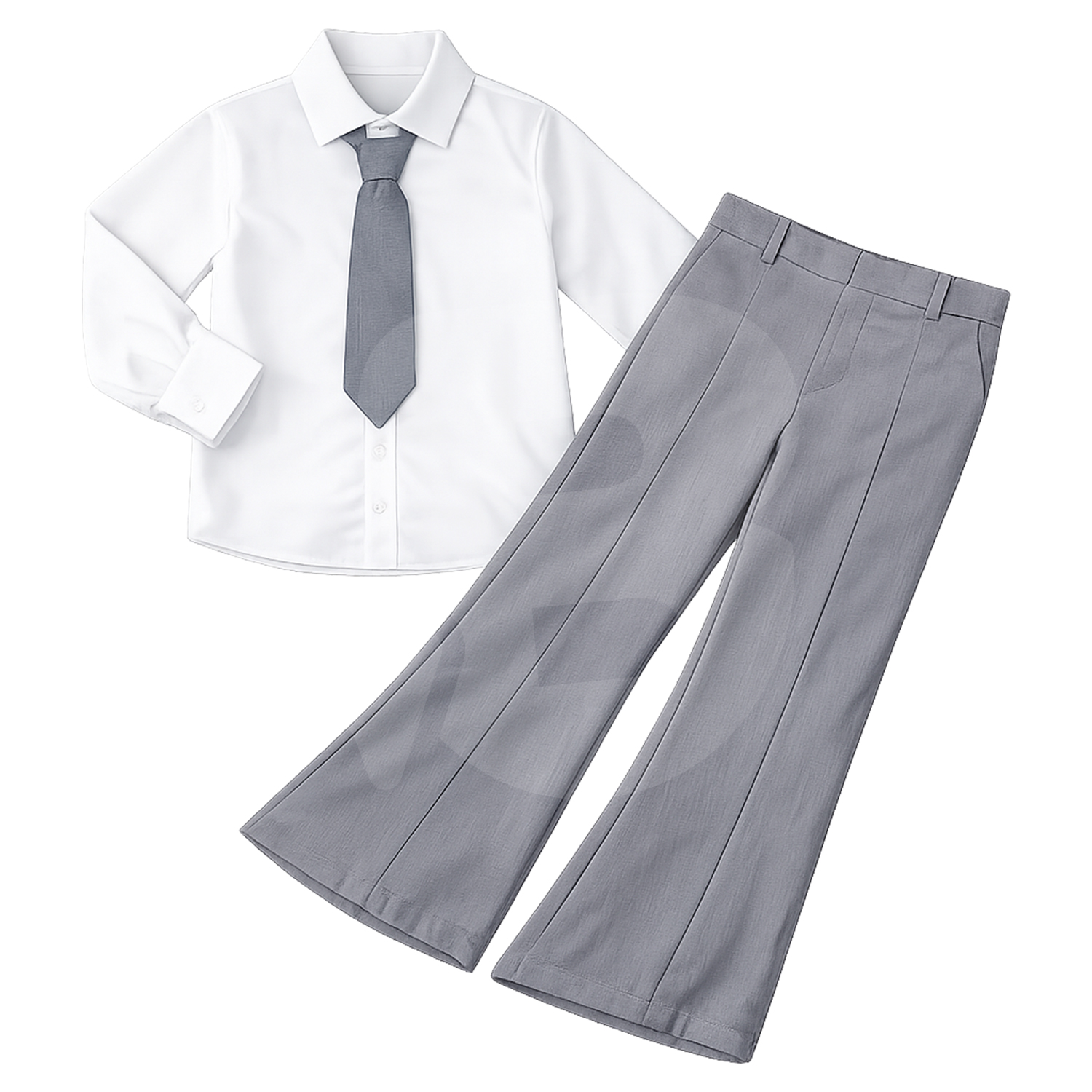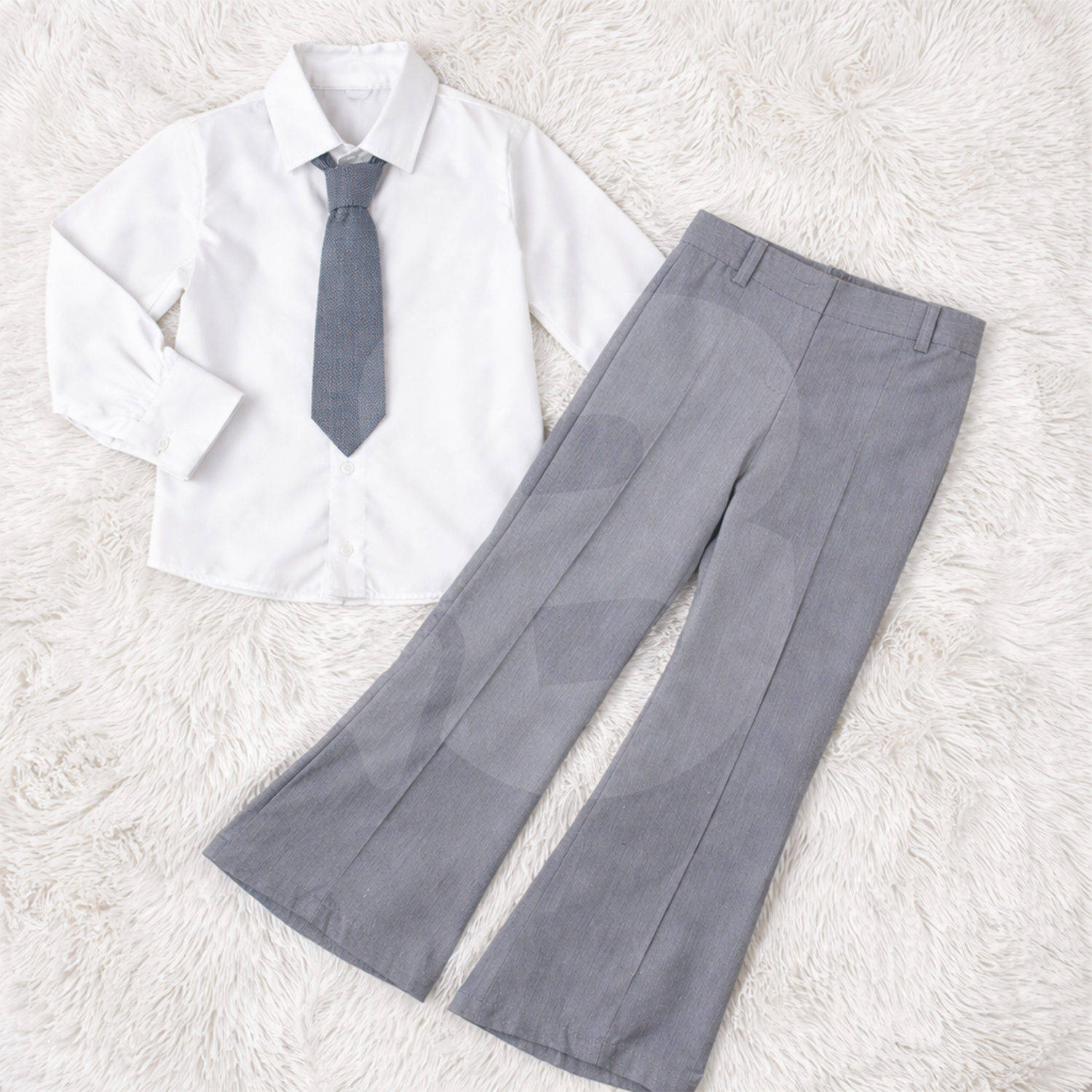 Setul este alcătuit din cămașă albă cu mânecă lungă, pantaloni gri cu croială dreaptă și cravată asortată, toate piesele fiind concepute pentru a funcționa împreună într-o ținută unitară. Cămașa albă are un design clasic, cu guler și închidere cu nasturi, oferind un aspect curat și ordonat. Pantalonii gri sunt realizați într-o nuanță neutră, ușor de integrat în ținute școlare sau elegante, având o croială simplă, adaptată copiilor.