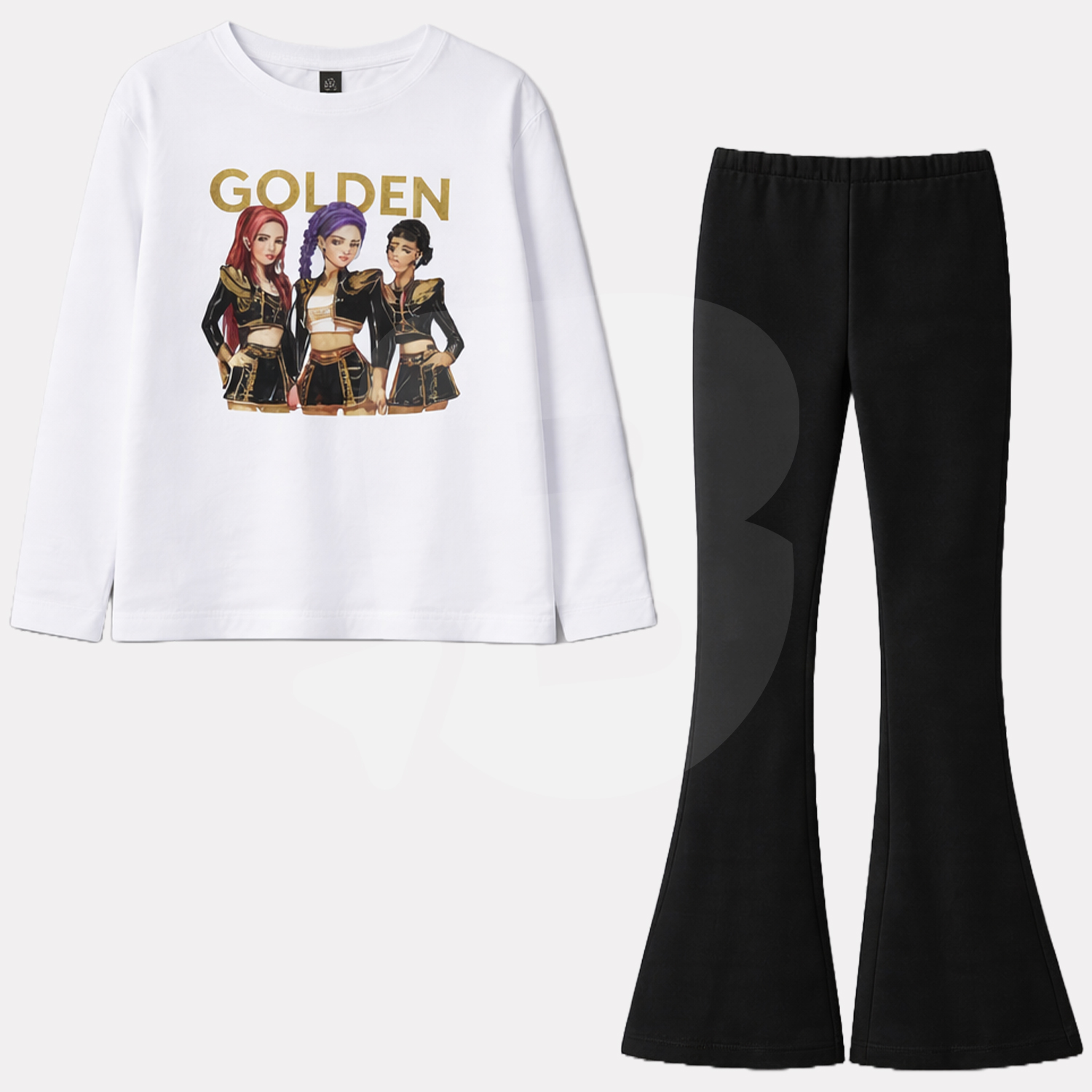 Bluza este realizată într-o nuanță curată de alb, cu un imprimeu frontal atractiv, în tonuri aurii, având inscripția „GOLDEN” și o grafică modernă, inspirată din stiluri vizuale apreciate de fete aflate în creștere. Materialul este plăcut la atingere, confortabil pentru purtare zilnică, iar croiala lejeră permite libertate de mișcare. Mânecile lungi și gulerul clasic rotund fac ca bluza să fie ușor de integrat în ținute de sezon, atât pentru școală, cât și pentru activități zilnice sau ieșiri în oraș.