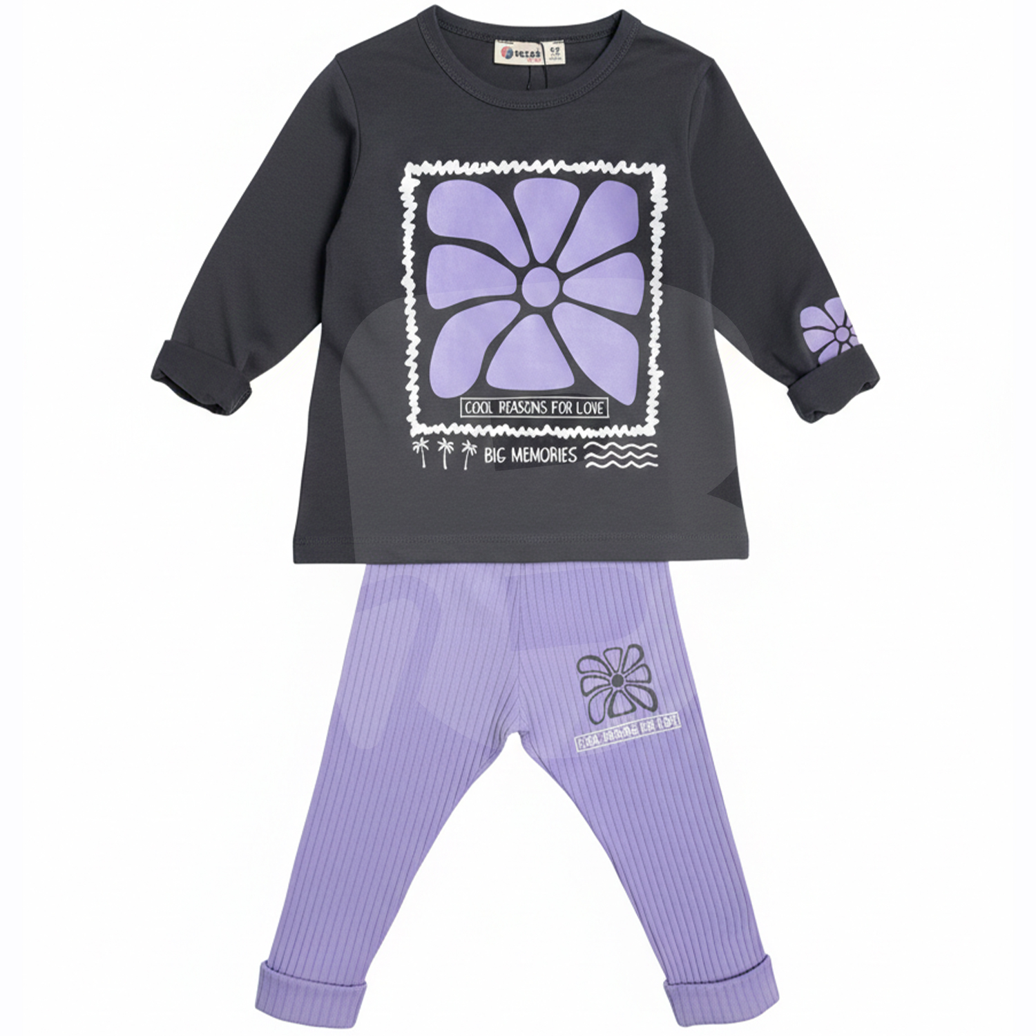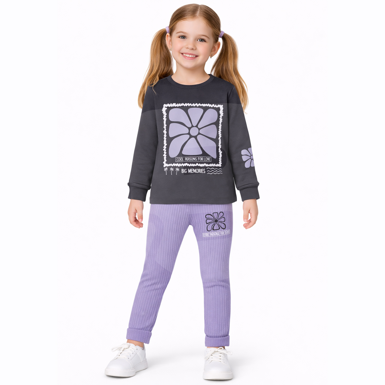 Compleul pentru fete subțire 2 piese cu bluză gri antracit și pantaloni lila este un produs vestimentar destinat vânzării en-gros, conceput pentru magazine de haine pentru copii, buticuri, comercianți online și revânzători care caută articole moderne, ușor de comercializat și potrivite pentru sezonul de tranziție. Modelul este realizat într-un design actual, cu imprimeu floral stilizat, atractiv pentru segmentul de vârstă 3–10 ani.