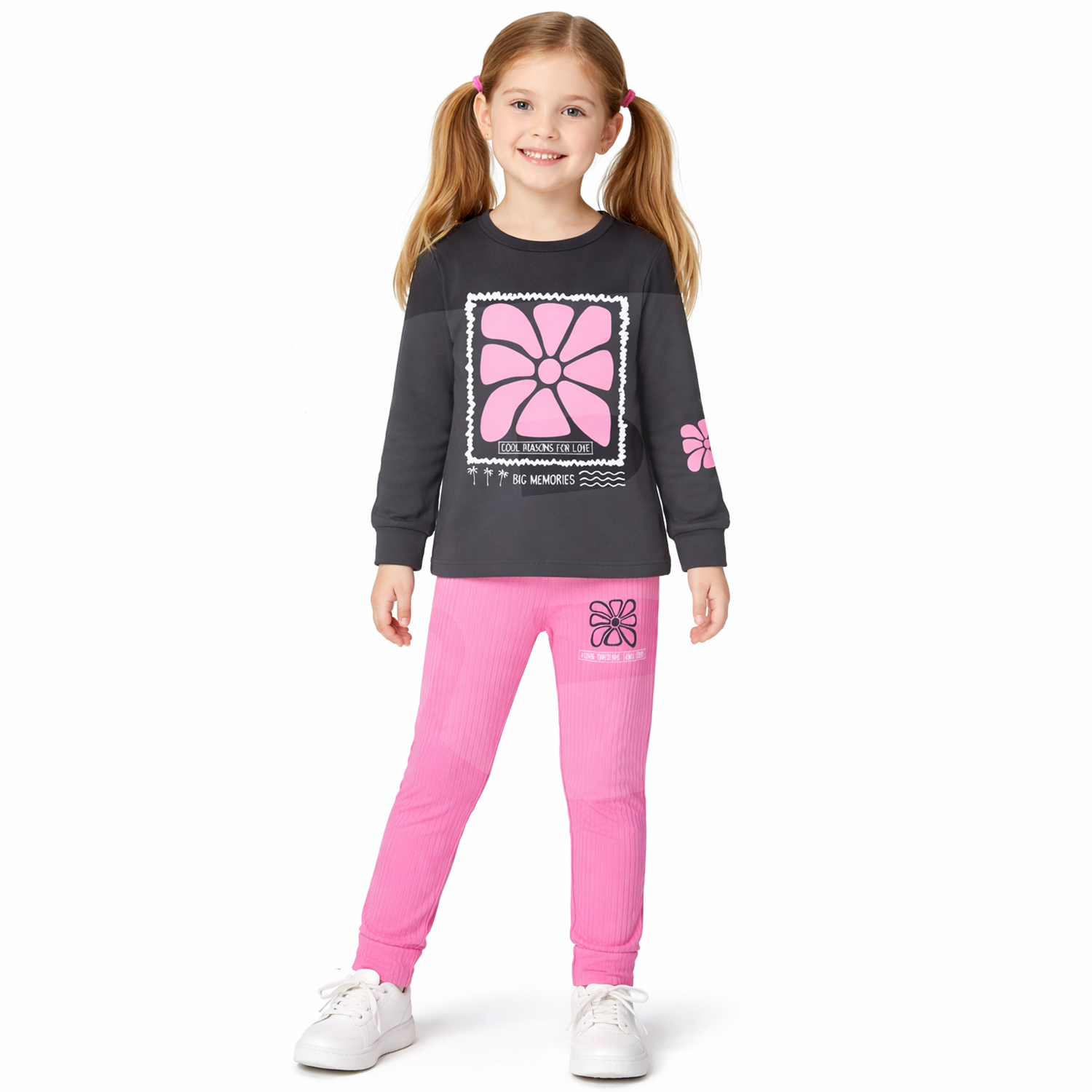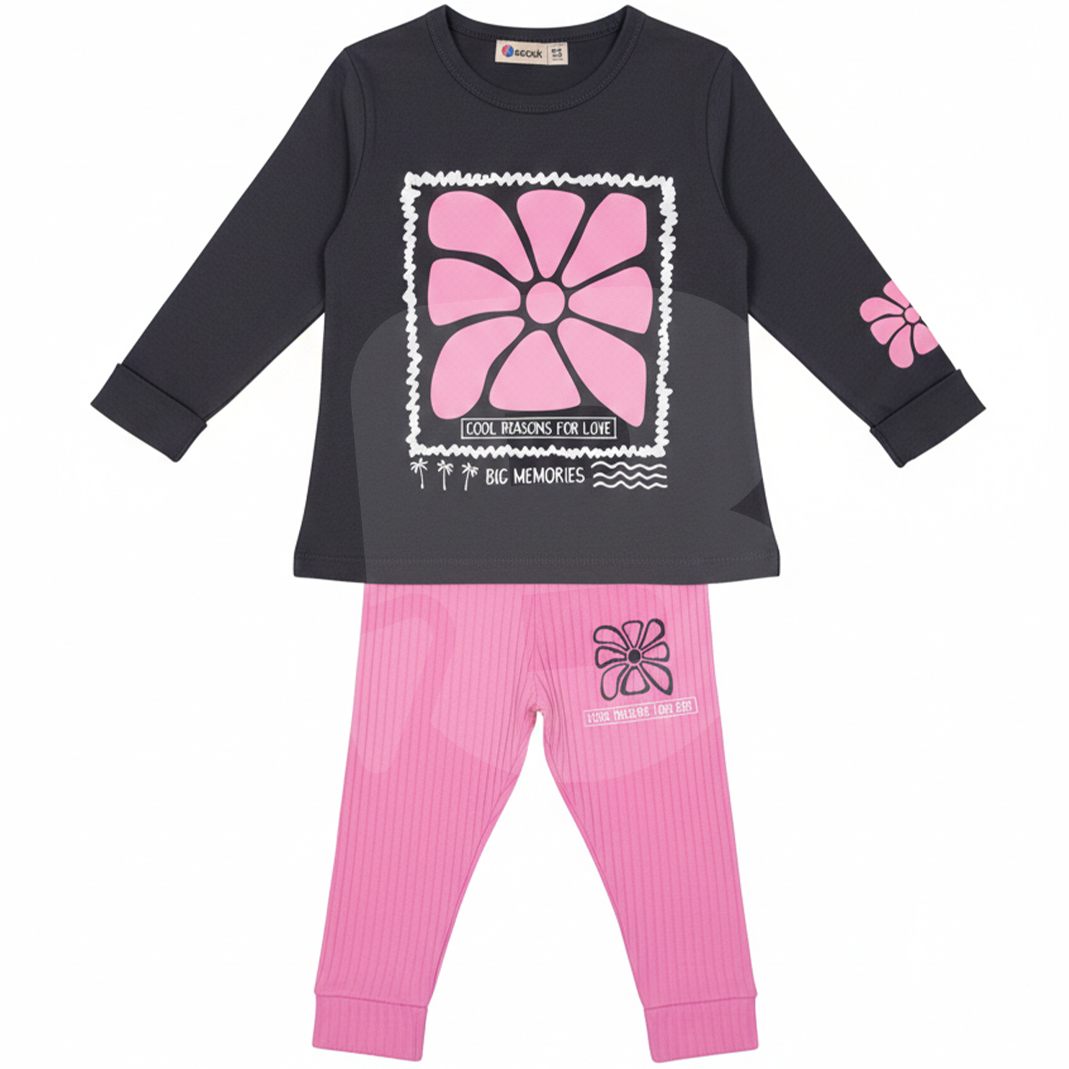 Compleul este compus din bluză cu mânecă lungă și pantaloni lungi, realizate din material subțire, confortabil, potrivit pentru purtare zilnică. Bluza are culoare gri antracit, fiind decorată cu imprimeu roz modern, iar pantalonii sunt roz, într-o nuanță plăcută, ușor de integrat în ținute casual pentru copii. Combinația de culori este echilibrată și atractivă, adaptată preferințelor actuale din segmentul de îmbrăcăminte pentru fete.