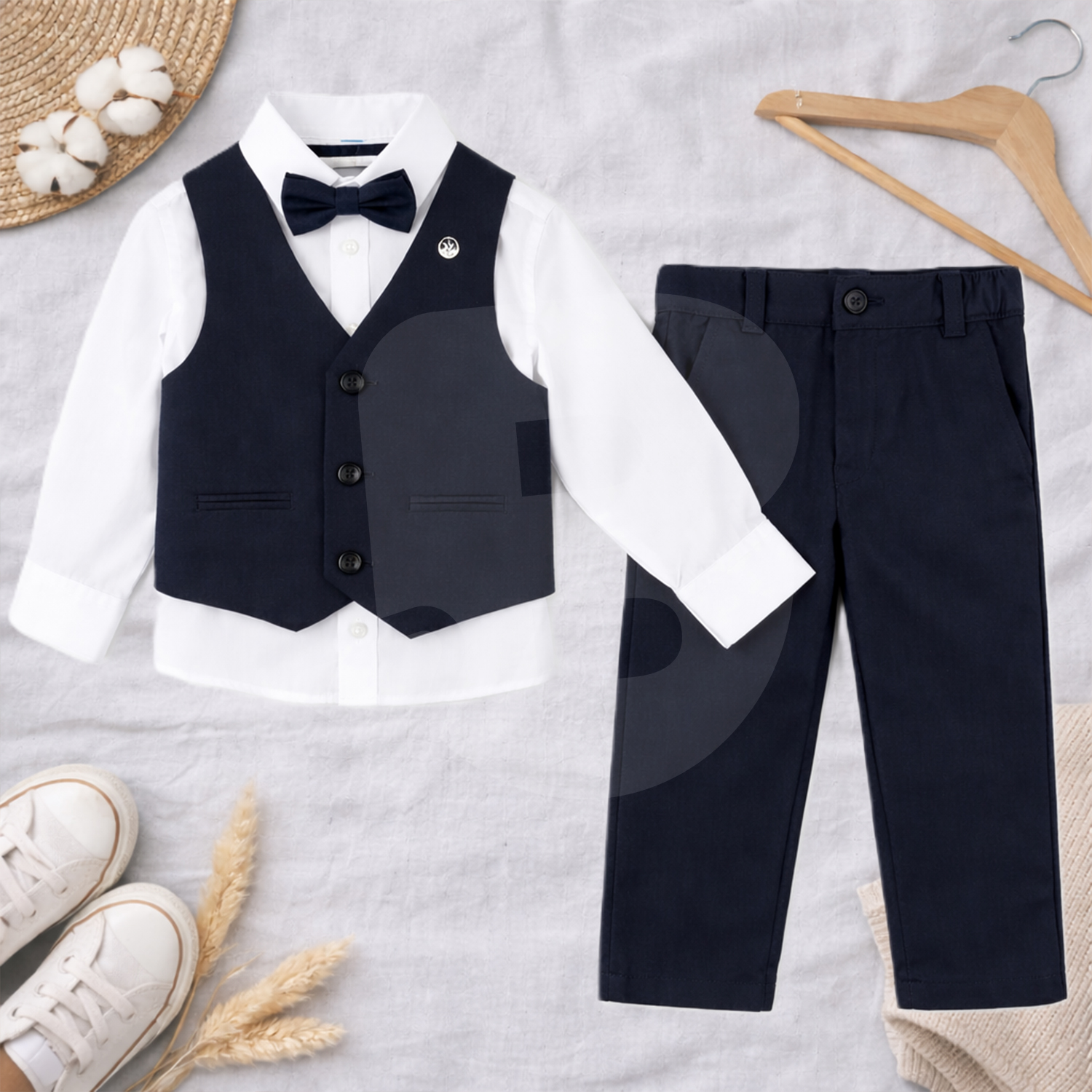 Costumul include cămașă albă cu mânecă lungă, vestă bleumarin elegantă, papion asortat și pantaloni bleumarin, toate piesele fiind gândite pentru a crea o ținută completă, armonioasă și ușor de prezentat la raft sau online. Nuanța de bleumarin este una clasică, foarte solicitată, potrivită pentru ceremonii, evenimente școlare, aniversări, ședințe foto sau ocazii formale.
