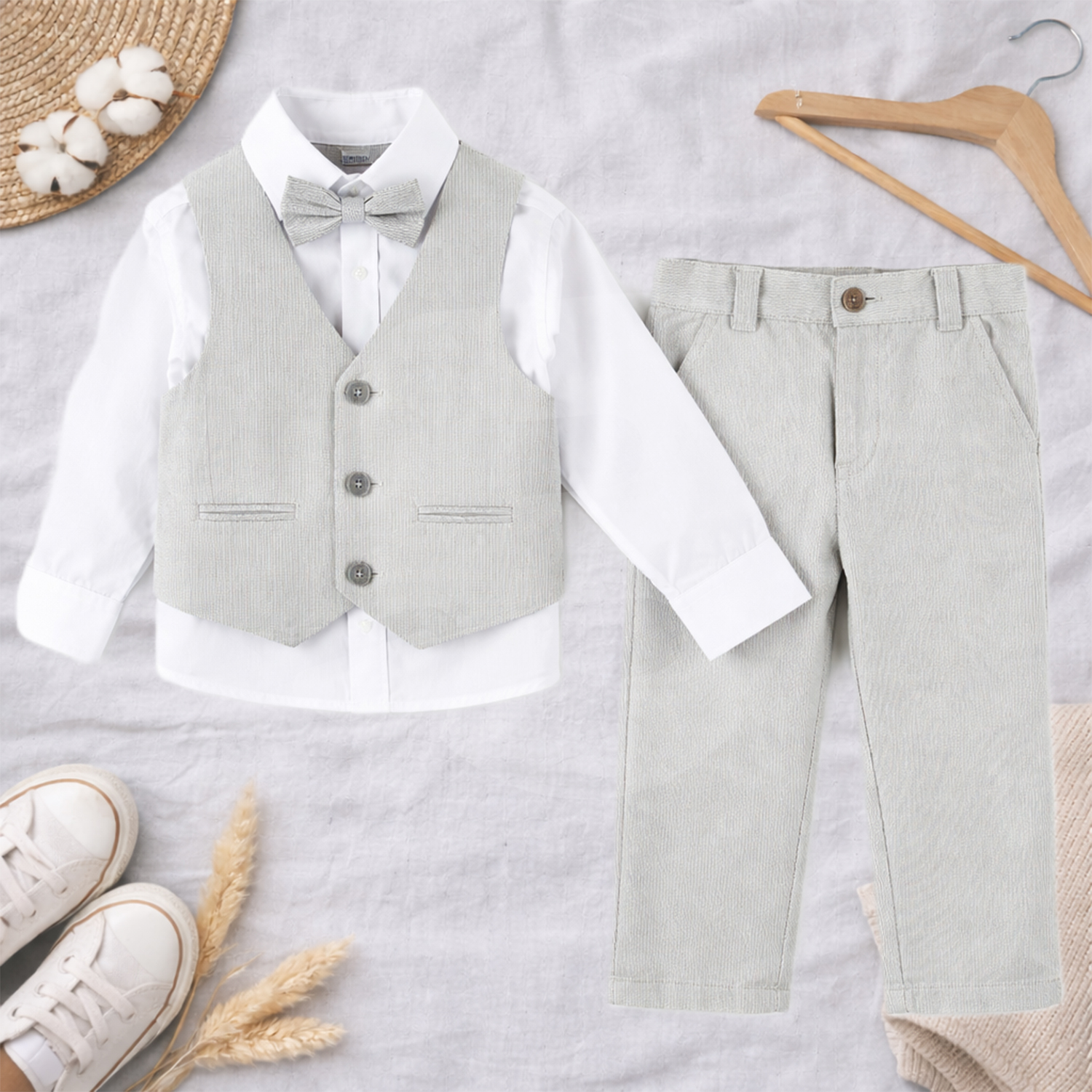 Setul este compus din cămașă albă cu mânecă lungă, vestă elegantă gri-bej, papion asortat gri-bej și pantaloni gri-bej, piesele fiind perfect coordonate cromatic pentru a crea o ținută rafinată, echilibrată și modernă. Nuanța gri-bej este una caldă și elegantă, foarte apreciată pentru evenimente speciale, ceremonii, petreceri, aniversări sau festivități școlare, fiind o alternativă versatilă la culorile clasice.
