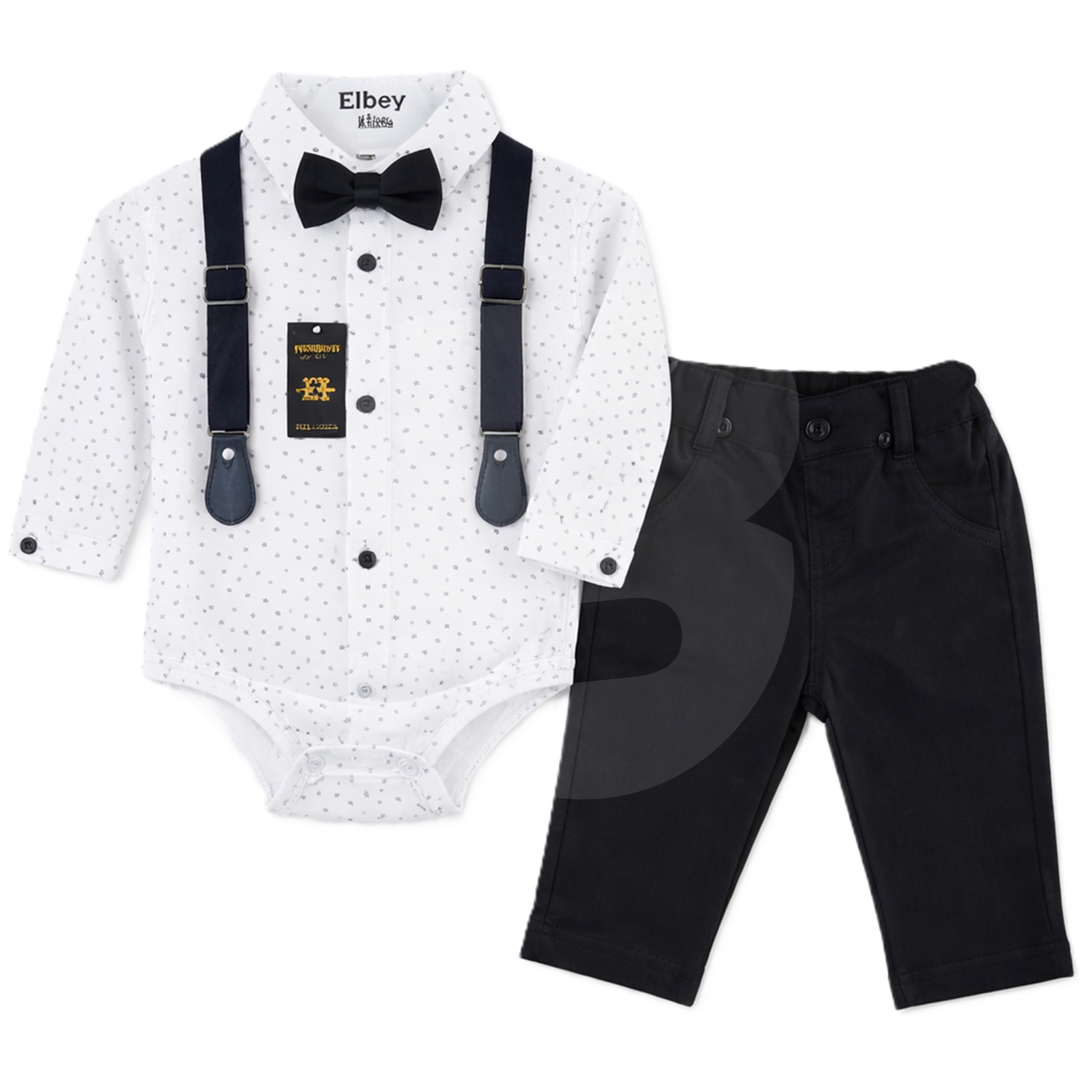 Setul include pantaloni bleumarin, body tip cămașă cu imprimeu discret și bretele decorative, elemente care oferă un aspect elegant și bine definit. Body-ul este prevăzut cu sistem de închidere practică între picioare, facilitând îmbrăcarea rapidă și schimbarea scutecului. Pantalonii sunt realizați cu croială comodă, potrivită pentru mișcarea naturală a bebelușilor, iar bretelele completează ținuta cu un plus de stil.