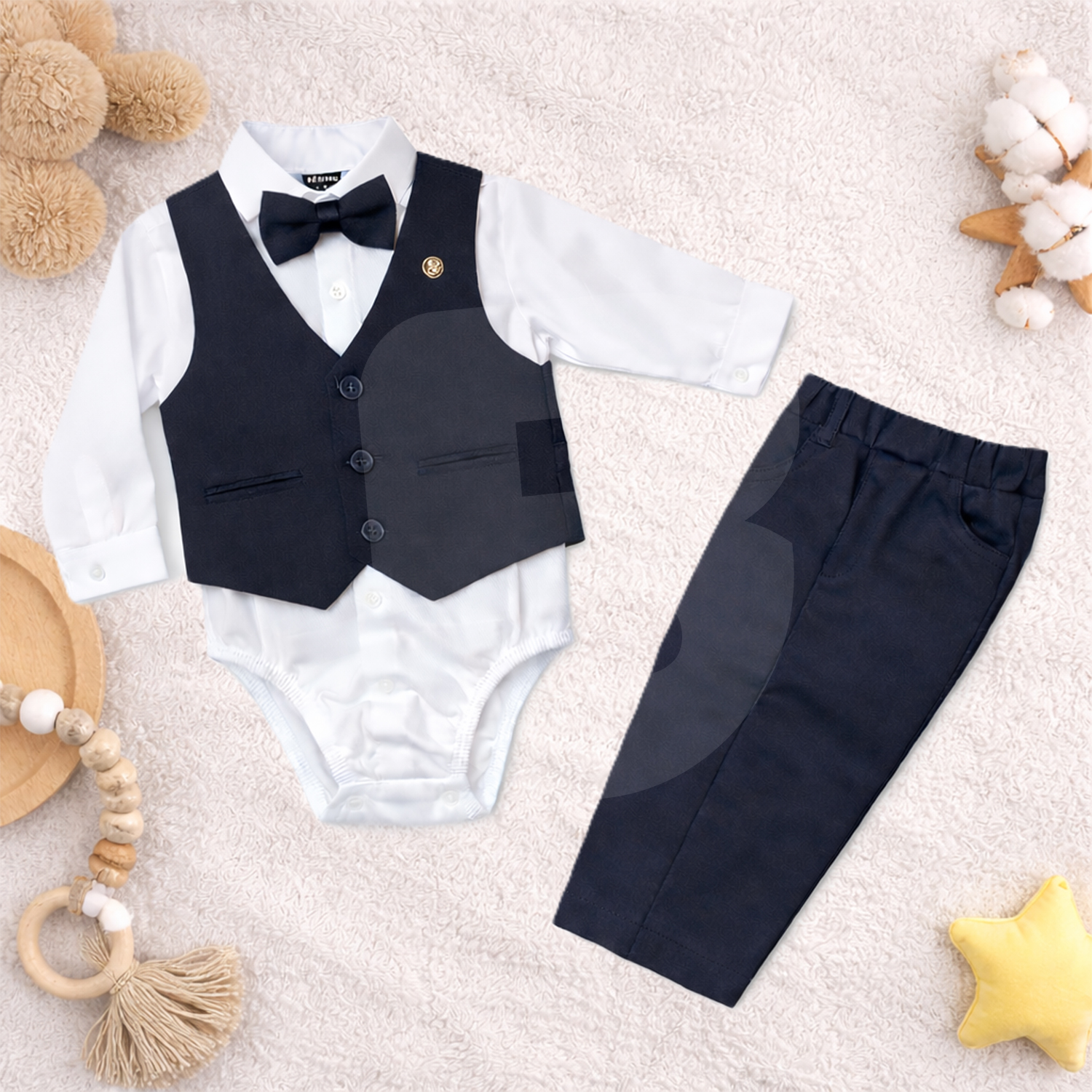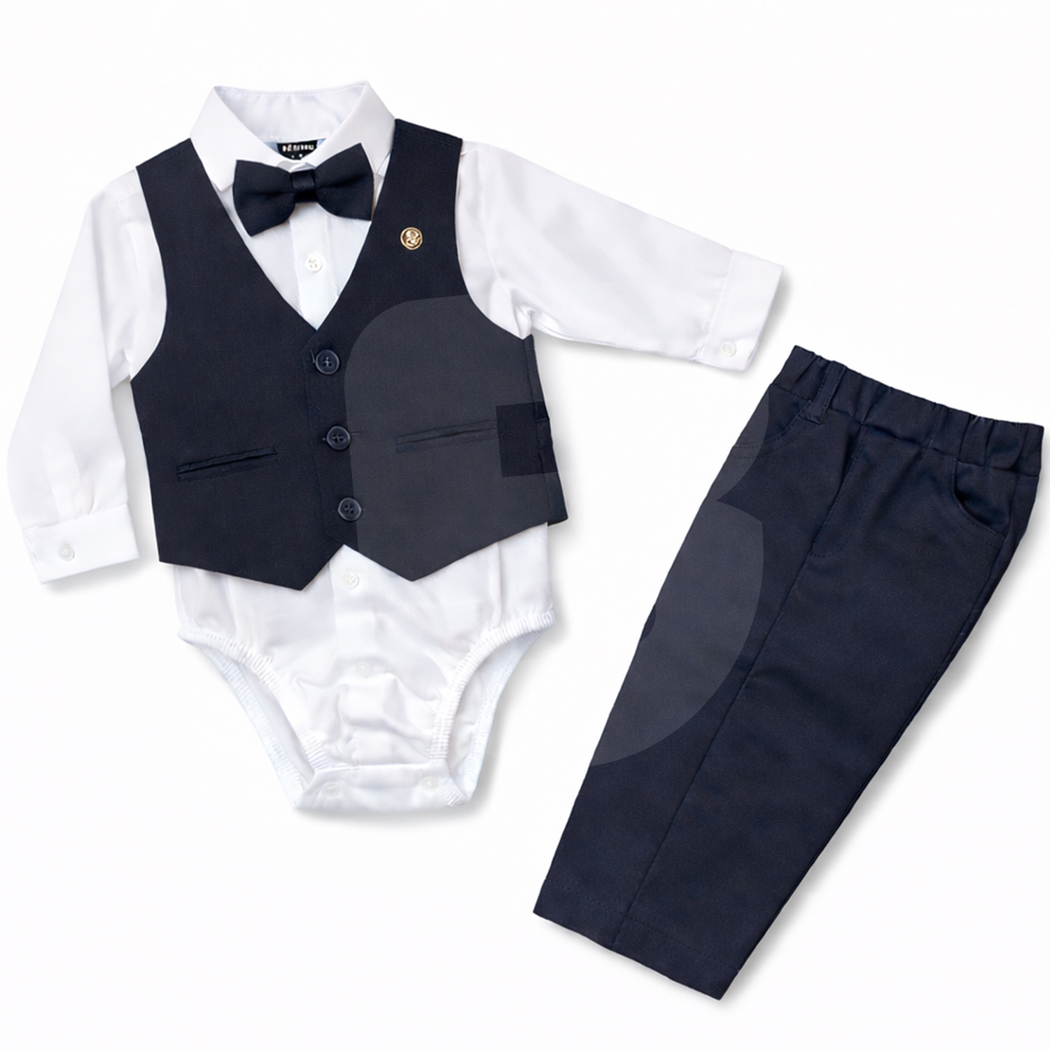 Fiecare costum este format din 4 piese atent asortate: body tip cămașă albă cu mânecă lungă, vestă elegantă culoare bleumarin, papion asortat și pantaloni bleumarin, rezultând o ținută completă, modernă și echilibrată cromatic. Designul este clasic, cu accente elegante, potrivit pentru botezuri, aniversări, ședințe foto sau alte evenimente festive.