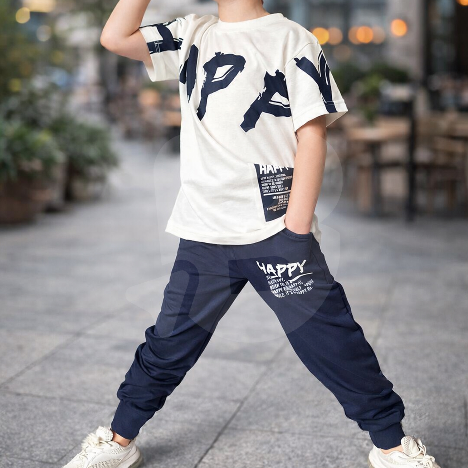 Fiecare compleu este compus din 2 piese: tricou cu mânecă scurtă și pantaloni lungi subțiri, realizate din bumbac, material apreciat pentru confort, respirabilitate și rezistență la purtare zilnică. Tricoul are croială lejeră și imprimeu modern cu text, iar pantalonii sunt prevăzuți cu talie elastică și șnur decorativ, oferind libertate de mișcare și potrivire optimă.