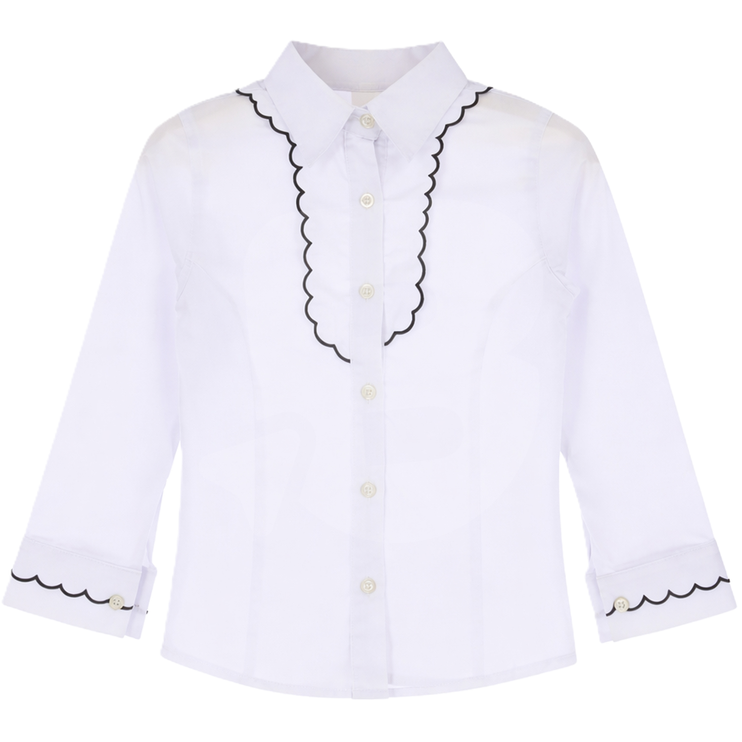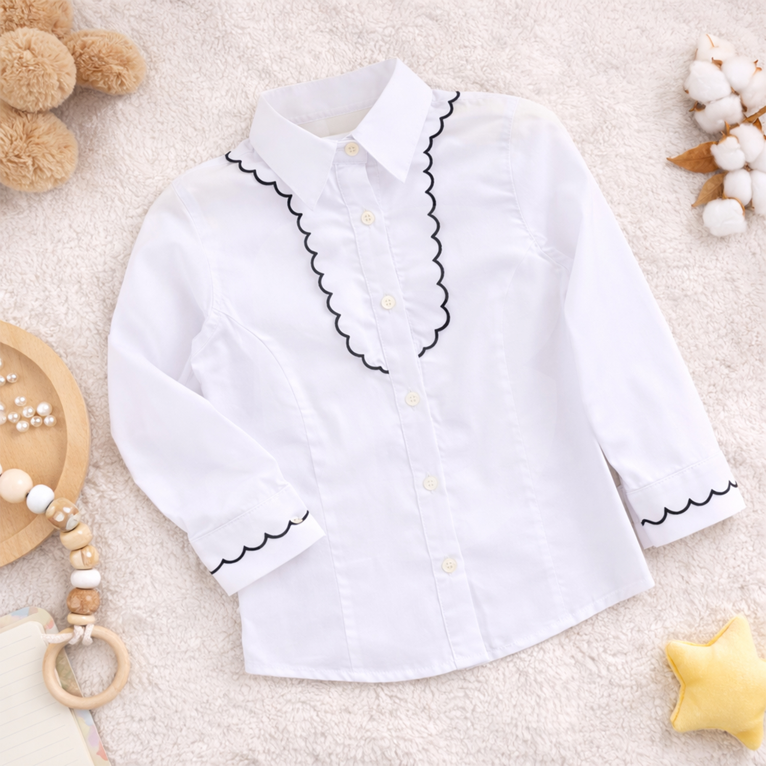 Modelul se remarcă prin designul clasic cu guler tip cămașă, completat de detalii decorative discrete cu contur negru ondulat aplicate în zona pieptului și la manșete. Aceste accente elegante adaugă un plus de rafinament, fără a încărca vizual produsul, fiind potrivite atât pentru uniformă școlară, cât și pentru serbări, aniversări sau ocazii speciale.