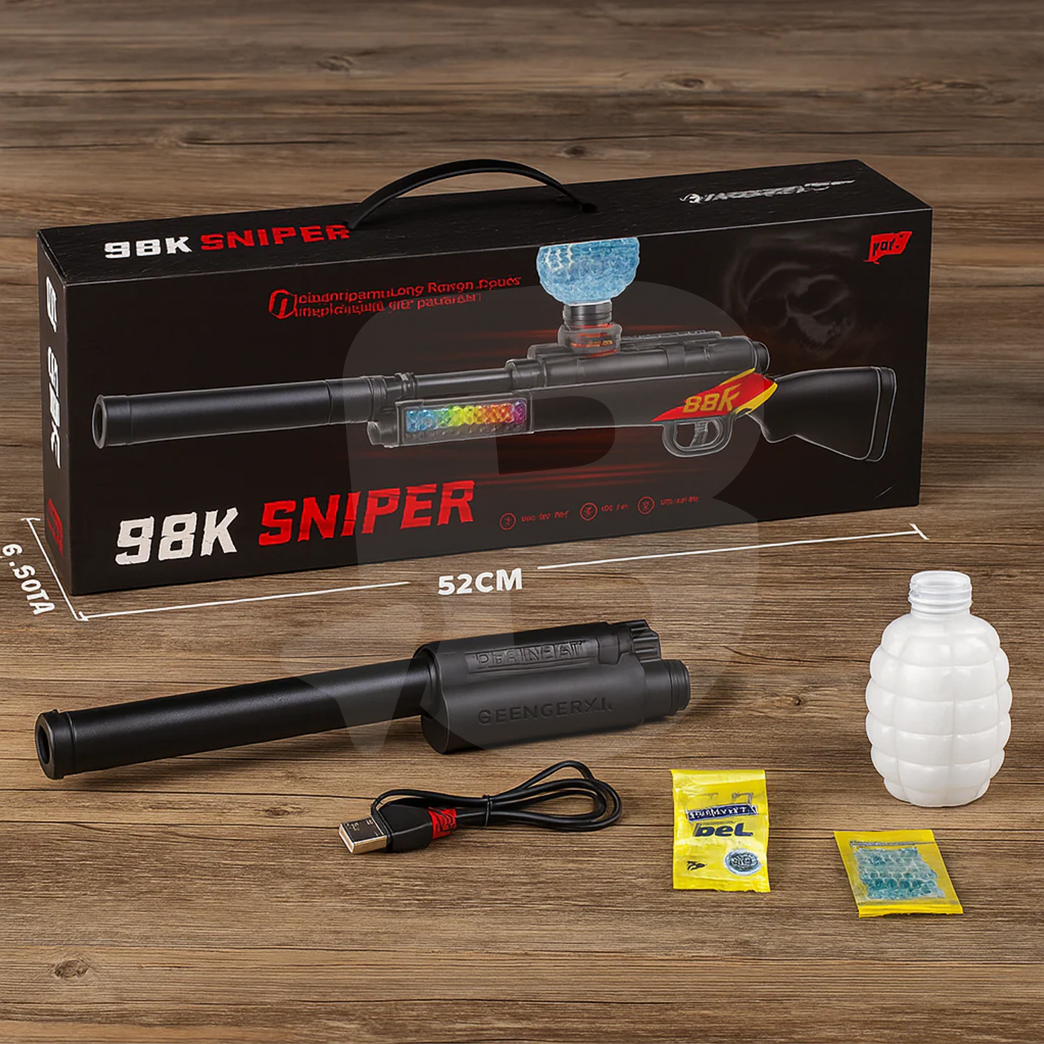 Setul include 500 bile gel, cablu USB pentru încărcare, recipient pentru bile și accesorii dedicate, oferind un pachet complet, gata de utilizare imediată. Arma este alimentată cu baterie reîncărcabilă, inclusă în pachet, ceea ce o face practică pentru utilizare repetată.