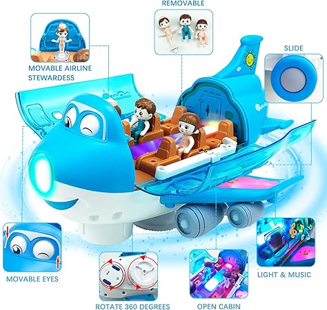 Avionul cu pasageri, electric, cu lumini și sunete, în culoare albastră, este o jucărie atractivă destinată vânzării en-gros, potrivită pentru magazine de jucării, papetării, magazine cadouri și comercianți care caută produse cu impact vizual și rulaj constant. Designul realist, inspirat de avioanele comerciale de pasageri, captează imediat atenția copiilor și încurajează jocul de rol.