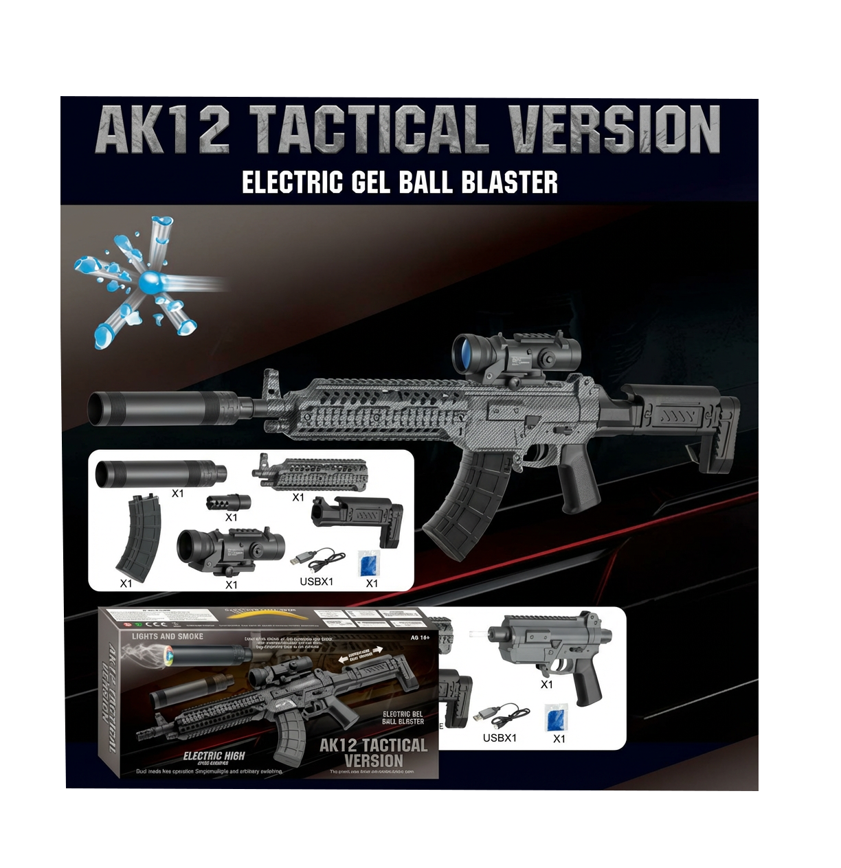 Echipat cu un acumulator reîncărcabil de mare capacitate, AK12 Tactical asigură o autonomie extinsă pe câmpul de luptă. Setul este complet, incluzând accesorii precum vizor optic, lunetă decorativă, încărcător de mare capacitate și ochelari de protecție, esențiali pentru siguranța utilizatorului. Este o jucărie care promovează activitatea fizică, lucrul în echipă și dezvoltarea reflexelor, fiind construită din materiale compozite rezistente la șocuri.