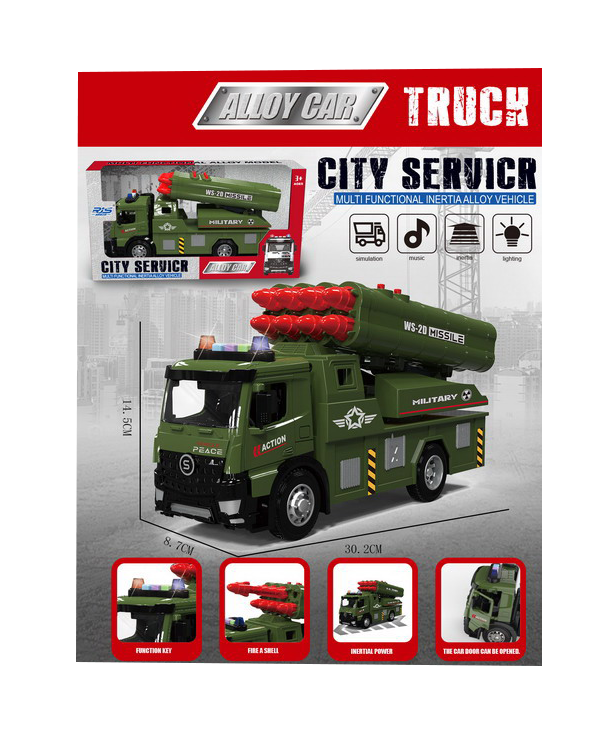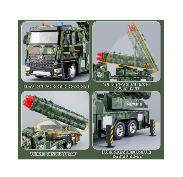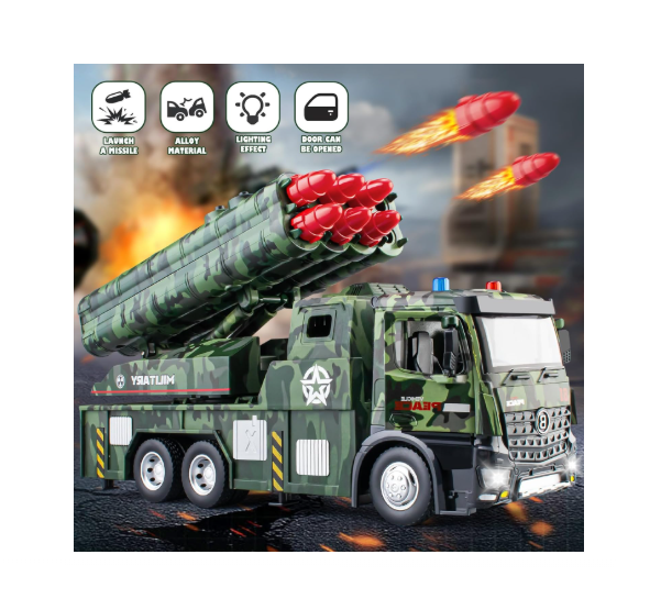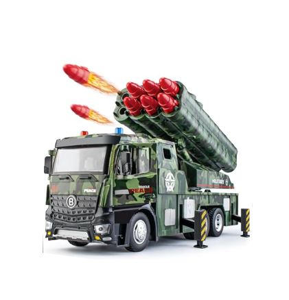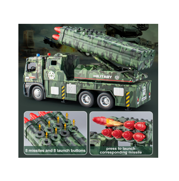 Pregătiți-vă pentru operațiuni strategice de apărare cu acest camion militar cu lansator de rachete, un vehicul robust creat pentru micii pasionați de tehnică militară. Acest model se distinge prin calitatea construcției, îmbinând rezistența unei cabine din metal (die-cast) cu funcționalitatea unui sistem de lansare multiplu. Designul realist și camuflajul specific unităților de artilerie fac din acest camion piesa centrală a oricărui scenariu de luptă pe care copiii îl pot imagina.