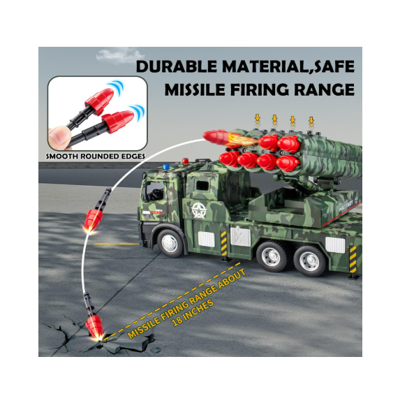 Vehiculul are o lungime de aproximativ 25 cm și este echipat cu un mecanism de propulsie prin frecare (friction power): este suficientă o simplă împingere pentru ca acesta să parcurgă singur o distanță considerabilă. Analizând platforma de lansare, camionul dispune de un post de artilerie mobil ce poate fi rotit și înclinat, pe care sunt montate 8 rachete gata de „misiune”. Cabina metalică oferă o greutate realistă și o durabilitate crescută la șocuri, în timp ce restul componentelor sunt fabricate din plastic ABS rezistent. Roțile din cauciuc permit o rulare silențioasă și o aderență excelentă pe suprafețe diverse, de la parchet până la teren accidentat în exterior.