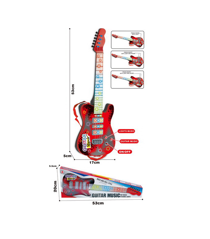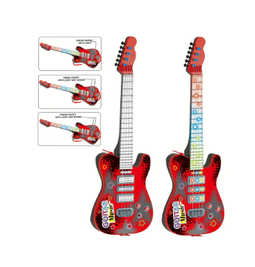 Pentru partenerii comerciali care caută jucării electronice cu mare căutare în rândul copiilor, acest model este disponibil pentru achiziție en-gros. Chitara se remarcă prin efectele vizuale spectaculoase: corpul instrumentului este dotat cu panouri LED care luminează intermitent în ritmul muzicii, oferind un show de lumini captivant. Sunetele sunt de înaltă fidelitate, imitând perfect distorsiunile și acordurile unei chitare electrice reale.