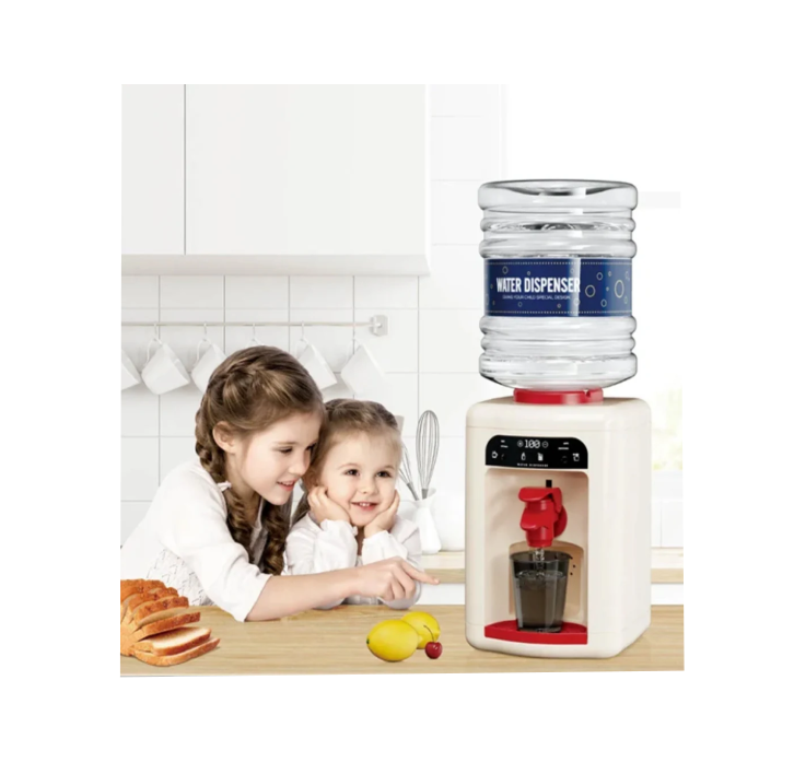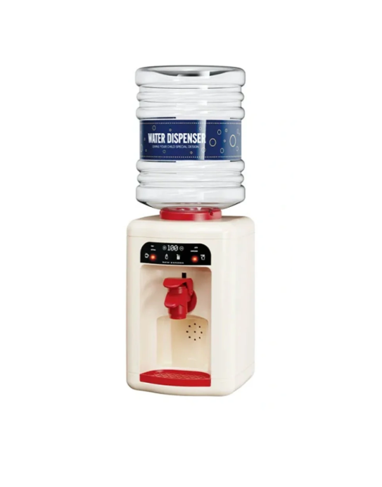 Modelul reproduce fidel aspectul unui dozator de apă clasic, cu bidon superior transparent, panou frontal decorativ, robinet funcțional și zonă pentru pahar. Designul este modern, în combinație de alb și roșu, iar bidonul superior este realizat din plastic transparent, cu etichetă decorativă „Water Dispenser”, exact ca în imaginile de prezentare. Panoul frontal este decorat cu elemente grafice ce imită un afișaj digital, contribuind la realismul general al jucăriei.