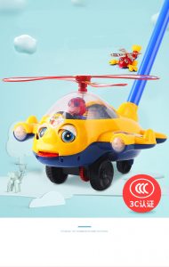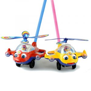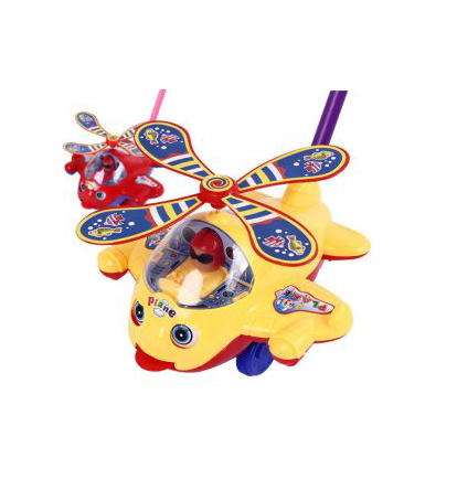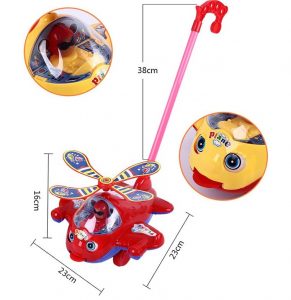 Elicopterul are o înălțime totală, cu mânerul montat, de aproximativ 55 cm, fiind adaptat perfect pentru statura copiilor aflați la începutul perioadei de mers. Analizând mecanismul său ingenios, pe măsură ce jucăria este împinsă pe podea, elicea principală începe să se rotească rapid, imitând decolarea unui aparat de zbor real. În același timp, roțile activează un dispozitiv sonor mecanic care produce sunete ritmice, captând atenția copilului și încurajându-l să continue plimbarea. Fabricat din plastic rezistent și ușor, elicopterul dispune de un mâner ergonomic ce poate fi detașat pentru o depozitare facilă. Este o jucărie clasică ce nu necesită baterii, fiind mereu gata de acțiune atât în interiorul locuinței, cât și în timpul plimbărilor prin parc.
