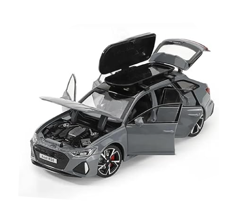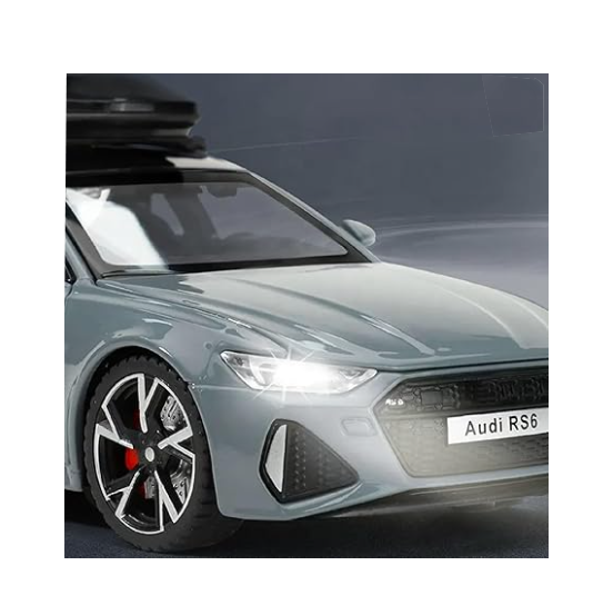 Scara 1:24, oferind un nivel superior de detaliere și o prezență impunătoare. Caroserie din aliaj metalic durabil (die-cast) cu finisaje de vopsea premium. Interactivitate maximă cu 6 elemente mobile: 4 uși, capotă și portbagaj cu deschidere completă. Sistem de sunete și lumini LED integrate pentru o simulare realistă a funcționării mașinii. Mecanism de propulsie Pull-Back ce permite deplasarea autonomă prin tragere înapoi. Anvelope din cauciuc moale și jante sport fidele modelului Audi RS original. Interior detaliat cu scaune sport, bord modelat și elemente de control vizibile. Disponibilă în culori atractive, specificate în varianta de stoc (negru, gri, albastru).