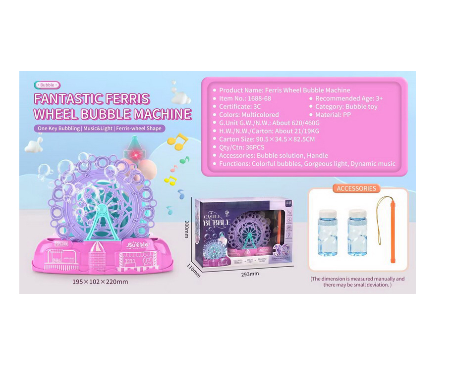 Transformați orice zi obișnuită într-un festival de bucurie cu ajutorul Mașinii de făcut baloane de săpun model Castel cu Roată Panoramică. Această jucărie interactivă spectaculoasă nu este doar un simplu generator de baloane, ci un centru de divertisment complet care combină estetica unui castel de basm cu dinamismul unei roți panoramice de parc de distracții. Concepută pentru a captiva atenția celor mici, jucăria eliberează un flux continuu de bule magice în timp ce roata se învârte, creând o atmosferă de poveste în grădină, pe terasă sau la petrecerile aniversare.
