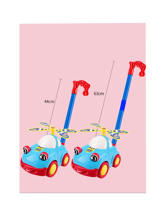 Vehiculul are o lungime de aproximativ 52 cm și este prevăzut cu un spătar înalt care oferă suport lombar sau poate fi folosit ca mâner pentru împingere de către părinți sau copii. Analizând funcțiile sale, mașinuța dispune de butoane care activează melodii vesele și sunete de motor, în timp ce elicea moale luminează și se învârte, stimulând vizual utilizatorul. Sub șezut se află un compartiment de depozitare generos, ideal pentru transportul jucăriilor preferate în timpul plimbărilor prin casă sau prin parc. Fabricată din plastic de înaltă calitate, cu margini rotunjite și roți late pentru stabilitate maximă, această mașină de împins asigură un mediu de joacă sigur și plin de zâmbete.