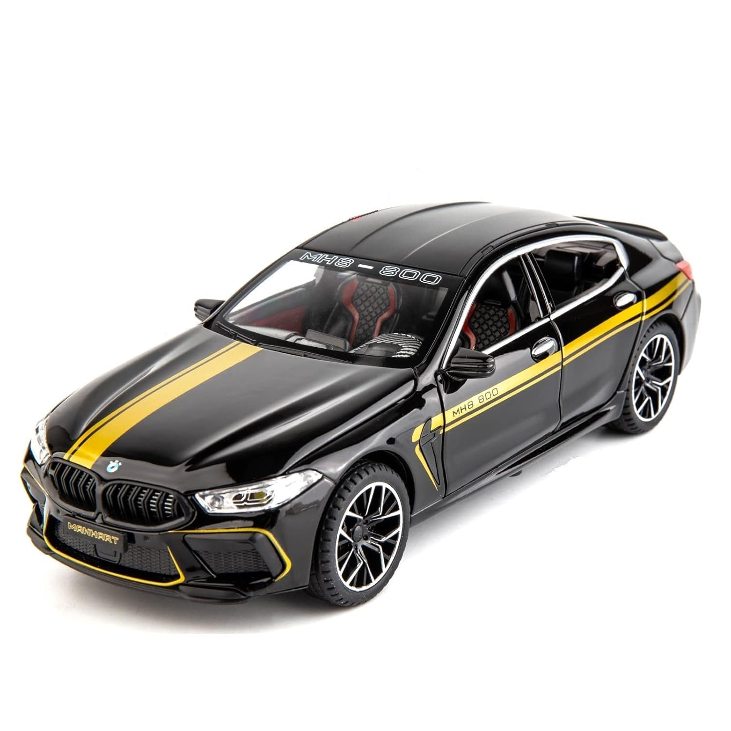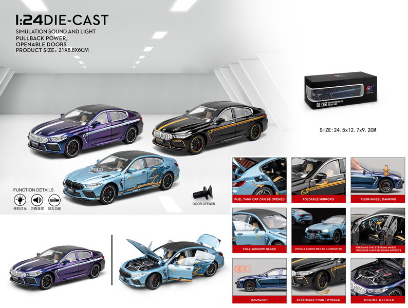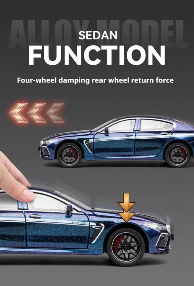 Pentru partenerii noștri en-gros, modelul M8 este extrem de atractiv datorită funcțiilor interactive avansate. Această mașină nu este doar un obiect static: prin apăsarea suspensiei sau deschiderea ușilor, se activează sunete realiste de motor și accelerație, acompaniate de faruri și stopuri LED care luminează intens. Designul interior este reprodus cu minuțiozitate, fiind vizibil prin cele două portiere frontale care se deschid, în timp ce capota și portbagajul funcționale permit examinarea compartimentului motor și a spațiului de depozitare.
