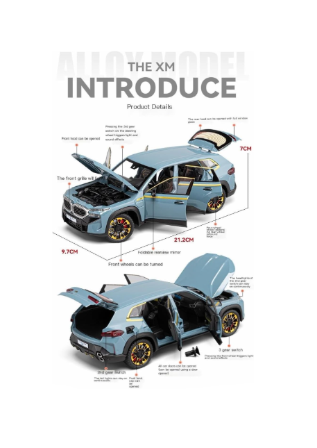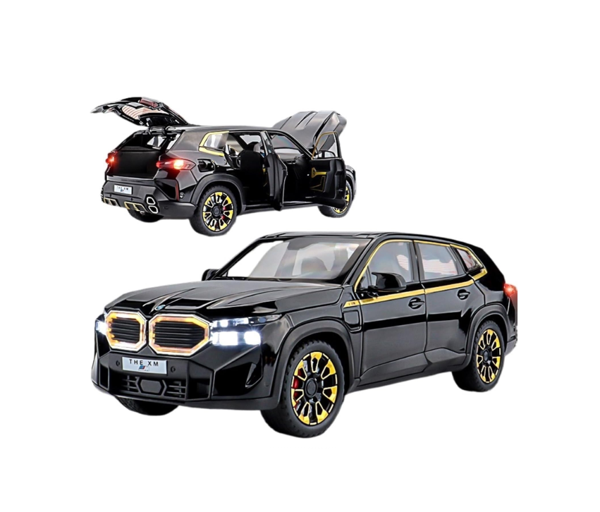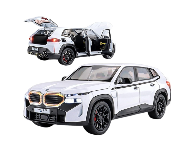Modelul BMW XM oferă o interactivitate completă: toate cele patru portiere, capota motorului și portbagajul se deschid, dezvăluind un interior meticulos lucrat și compartimentul motorului. Pentru a aduce experiența la un alt nivel, macheta este dotată cu un modul electronic care activează farurile și stopurile LED, precum și sunete realiste de pornire a motorului și accelerare la apăsarea roților frontale. Cu o lungime de aproximativ 21 cm, această replică fidelă combină estetica deosebită cu durabilitatea materialelor metalice, fiind ideală atât pentru expunere, cât și pentru sesiuni de joacă pline de acțiune.