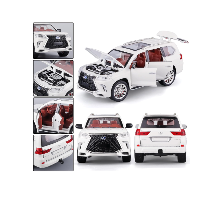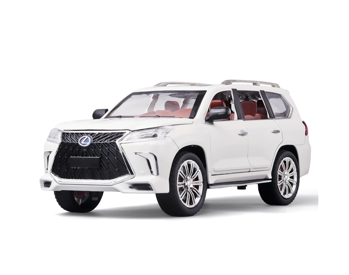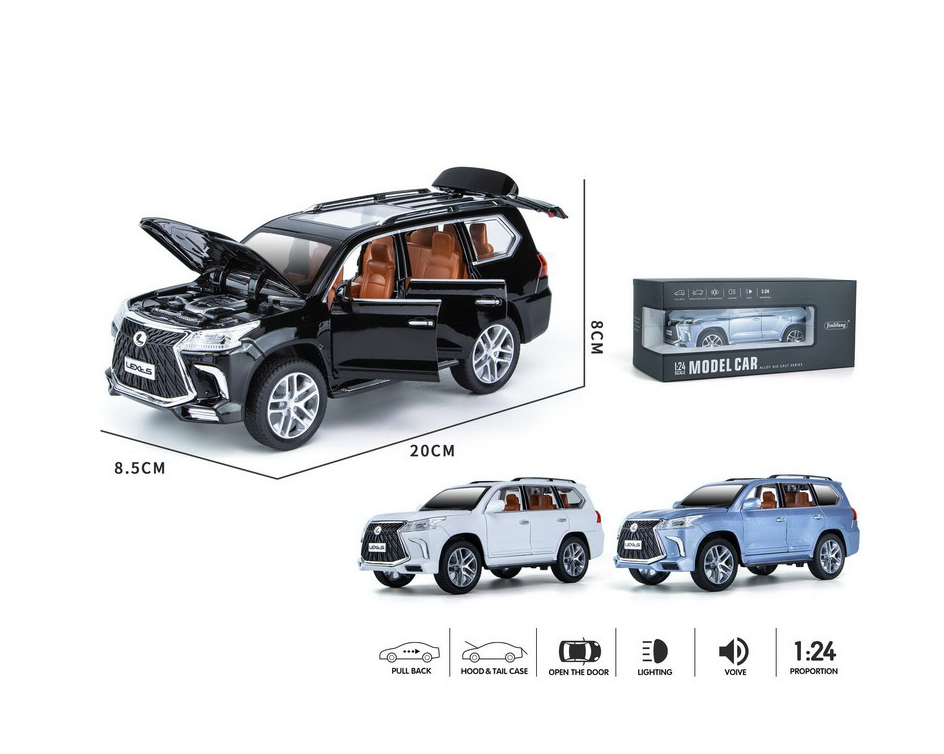 Mașina metalică Lexus LX570 SUV 1:24 este un model premium destinat comercializării en-gros, ideal pentru magazine de jucării, distribuitori, importatori și comercianți care doresc produse cu impact vizual puternic și grad ridicat de atractivitate la raft. Replica este realizată la scară 1:24 și reproduce fidel designul unui SUV de lux, cu detalii atent finisate, caroserie metalică solidă și interior detaliat.