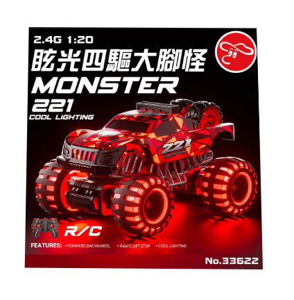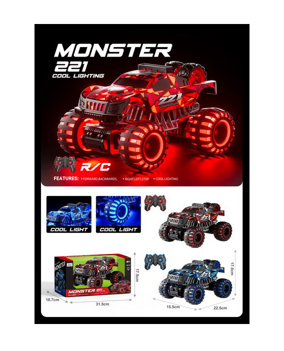 Construcția robustă și caroseria sport transformă această mașină Monster într-un produs atractiv pentru vânzarea en-gros, datorită cererii constante pentru jucării radiocomandate cu efecte luminoase. Sistemul de iluminare LED este integrat atât în caroserie, cât și la nivelul roților, oferind un efect vizual impresionant, mai ales în condiții de lumină redusă. Acest aspect contribuie direct la creșterea atractivității produsului în prezentările comerciale și în imaginile de promovare.