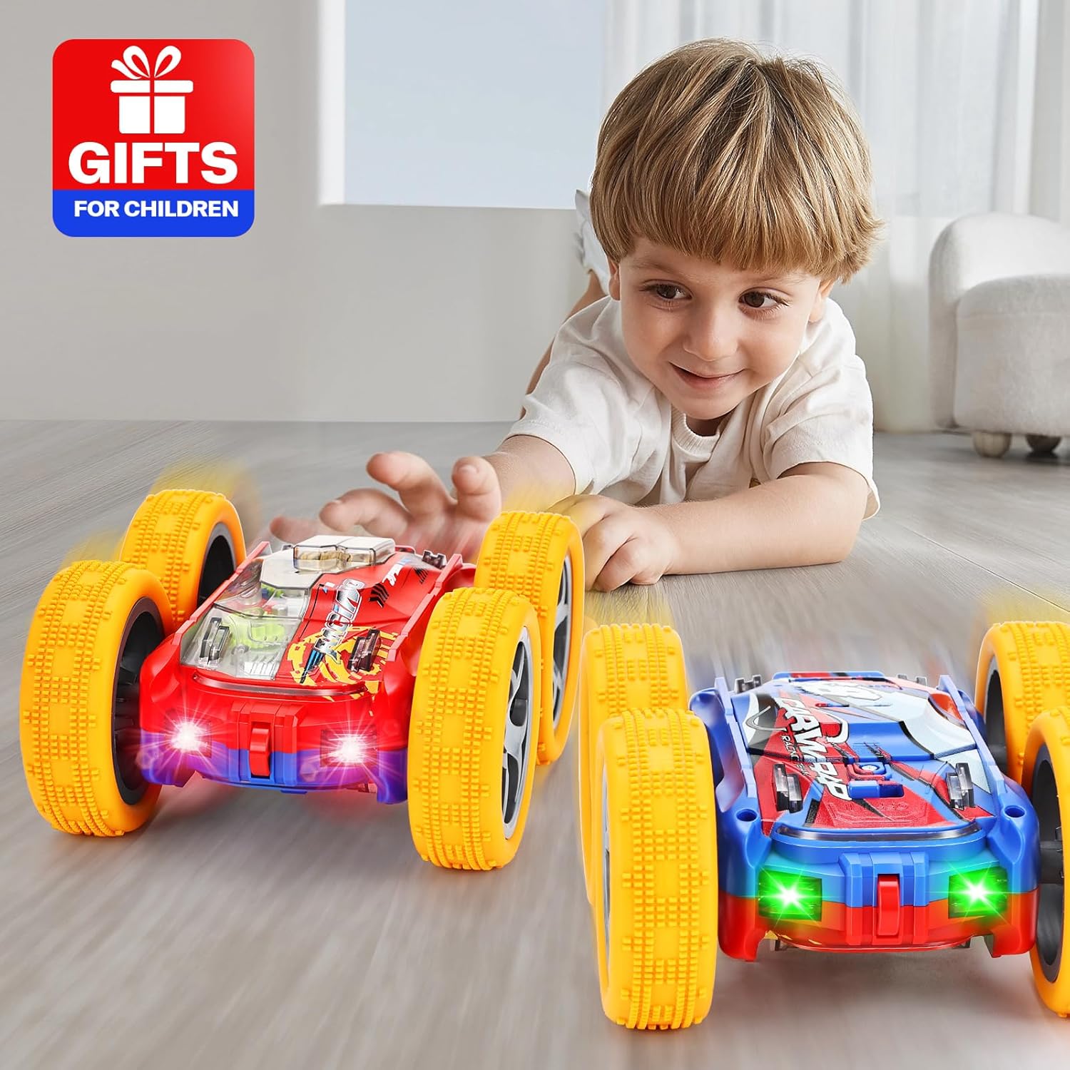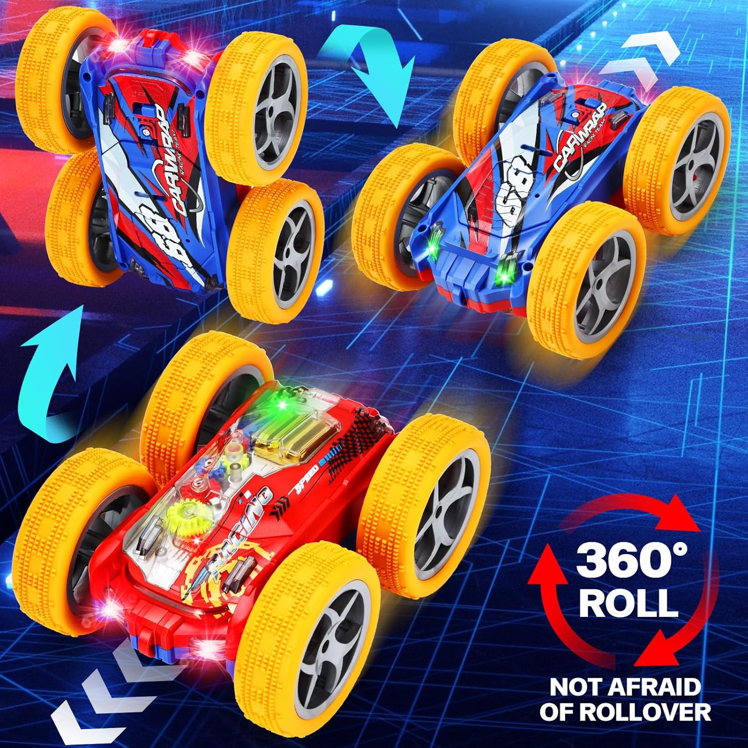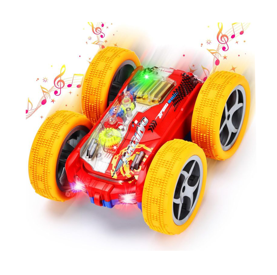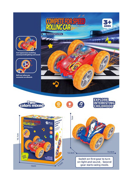 Mașina are o lungime de aproximativ 15 cm și este echipată cu anvelope de cauciuc speciale, care absorb șocurile și permit utilizarea pe diverse suprafețe, de la gresie la covoare. Analizând detaliile vizuale, „Rolling Car” este un adevărat festival de culori: roțile și caroseria sunt dotate cu lumini LED puternice care creează proiecții dinamice în timpul mișcării. În plus, difuzorul integrat redă melodii ritmate care se sincronizează perfect cu cascadoriile executate. Realizată din plastic policarbonat ultra-rezistent, această mașină este construită să îndure impacturi repetate, fiind cadoul ideal pentru copiii energici care doresc o jucărie interactivă și plină de viață.