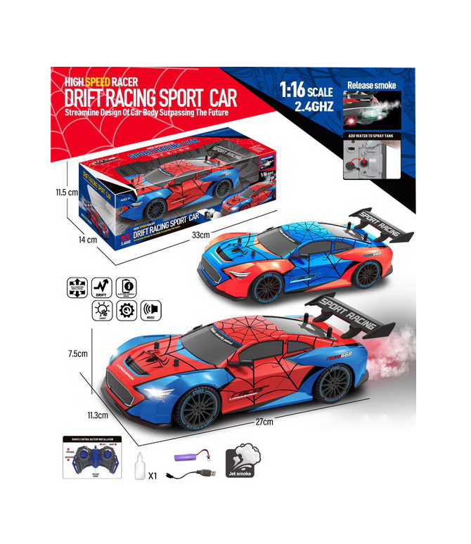 Pregătiți-vă pentru o experiență de condus extremă cu Mașina RC Drift Racing Spider, un vehicul de înaltă performanță proiectat special pentru fanii adrenalinei și ai manevrelor spectaculoase. Designul său agresiv, inspirat de agilitatea unui păianjen, este completat de o tehnologie inovatoare care va atrage toate privirile: efectul de fum (vapori de apă). Prin simpla adăugare de apă în rezervorul dedicat, mașina eliberează un nor de vapori prin sistemul de evacuare, simulând arderea anvelopelor în timpul drifturilor intense.