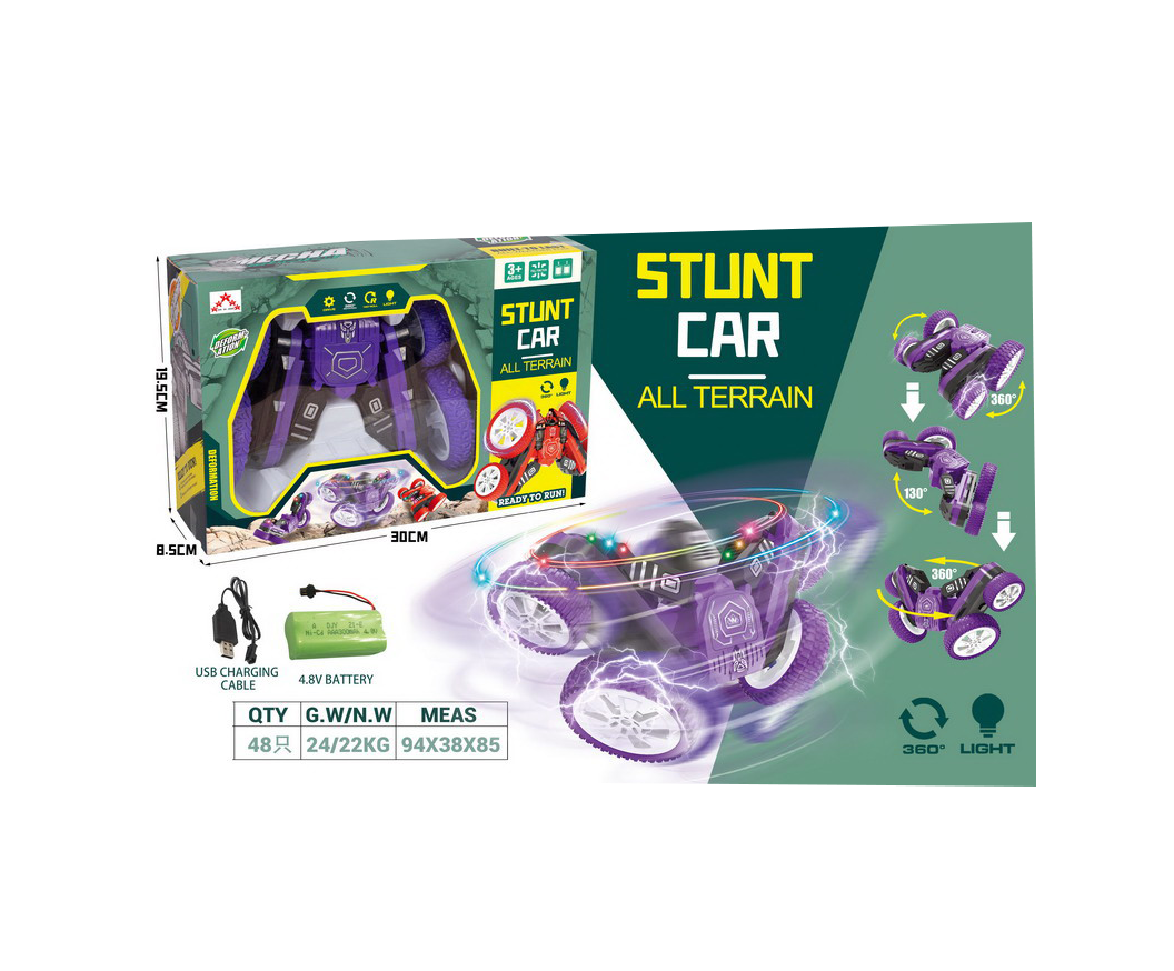 Mașina cu telecomandă Stunt Car este o jucărie interactivă destinată vânzării en-gros, ideală pentru magazine de jucării, comercianți online și revânzători. Modelul este conceput pentru mișcări spectaculoase, având funcție de rotație 360°, rulare pe ambele fețe și capacitate de deplasare pe diverse tipuri de suprafețe.