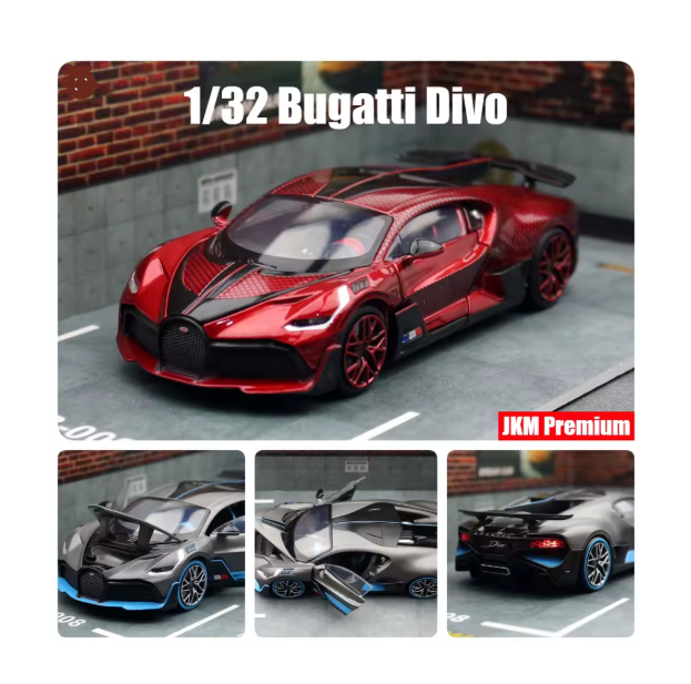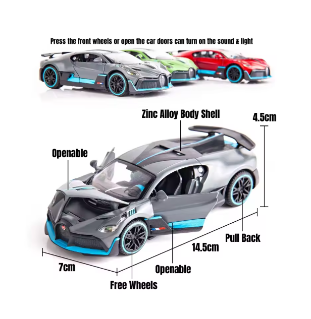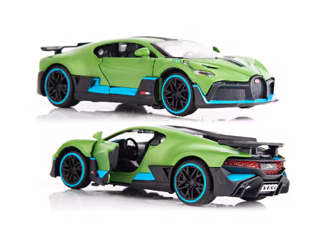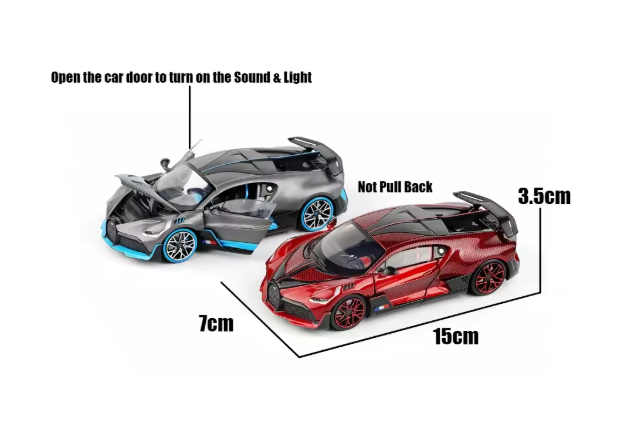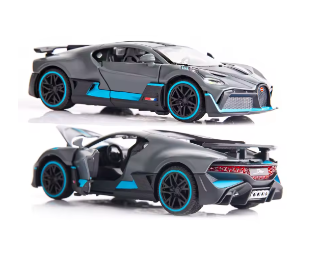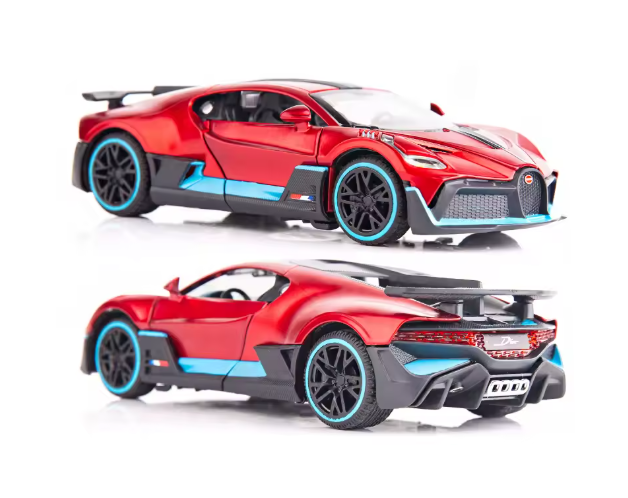 Mașinuța Bugatti Divo metalică cu lumini și sunete este un produs de colecție și joacă, conceput special pentru comercializare en-gros, adresat magazinelor de jucării, comercianților online, revânzătorilor și punctelor de vânzare care doresc produse atractive, premium și ușor de valorificat. Modelul reproduce fidel designul spectaculos al celebrului Bugatti Divo, fiind realizat din metal turnat (die-cast) combinat cu elemente din plastic rezistent, pentru un echilibru perfect între durabilitate și detaliu estetic.