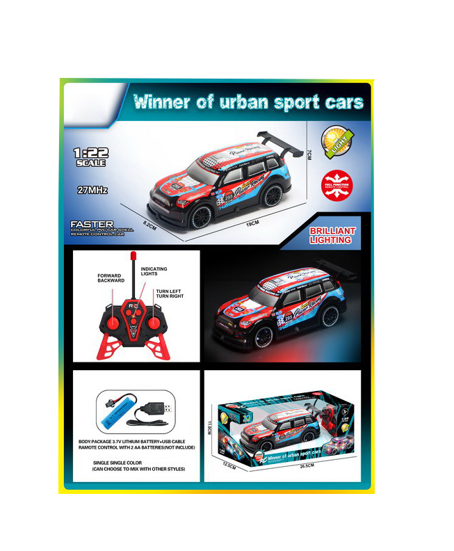 Mașinuța funcționează cu telecomandă radio pe frecvență 27 MHz, conform informațiilor vizibile pe ambalaj. Controlul permite deplasarea înainte și înapoi, precum și viraj la stânga și la dreapta. Pe telecomandă sunt marcate clar funcțiile de direcție, ceea ce face produsul intuitiv și ușor de utilizat. În timpul funcționării, mașina dispune de efecte de iluminare, evidențiate ca „brilliant lighting” pe ambalaj, care sporesc atractivitatea vizuală, mai ales în condiții de lumină redusă.