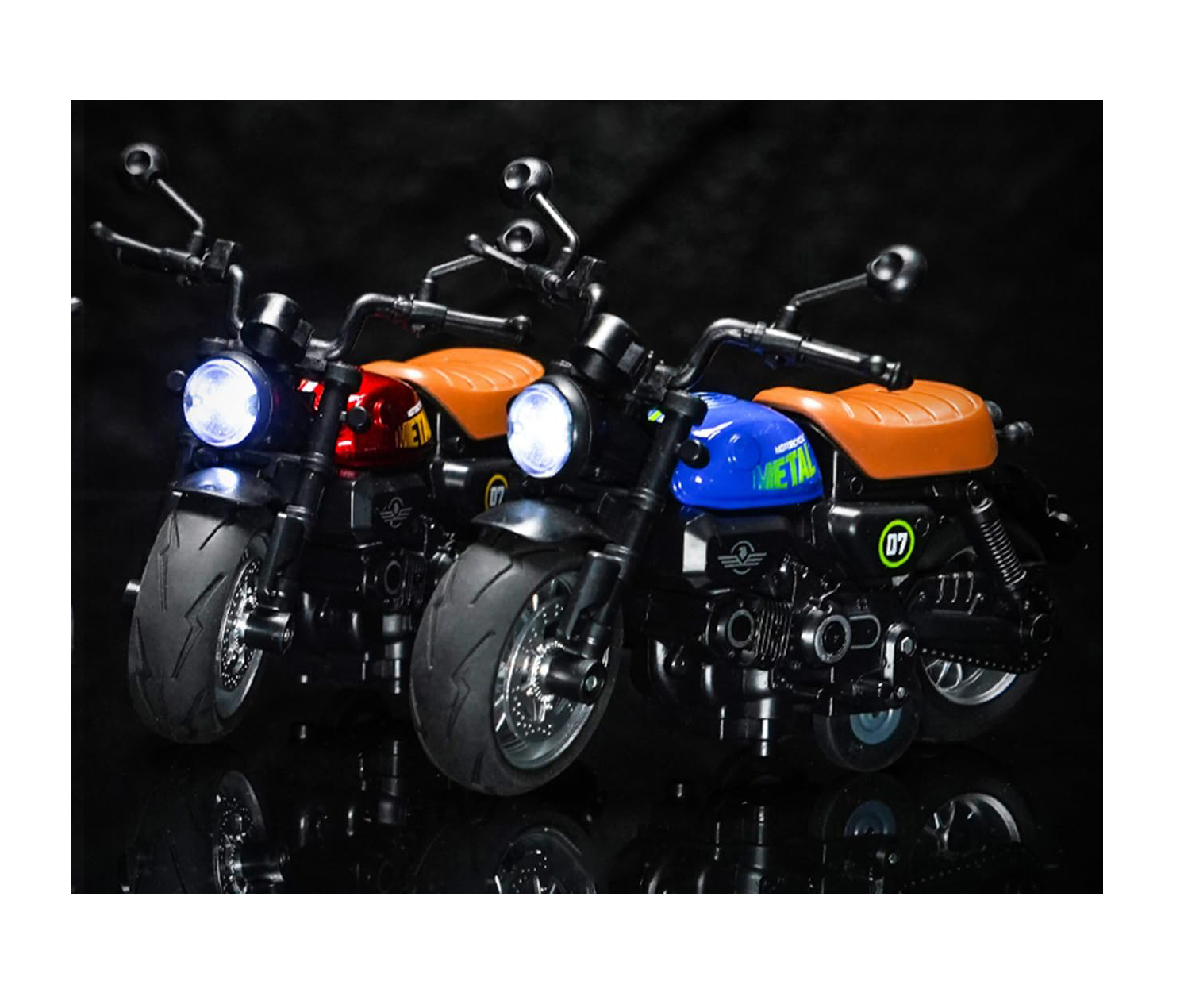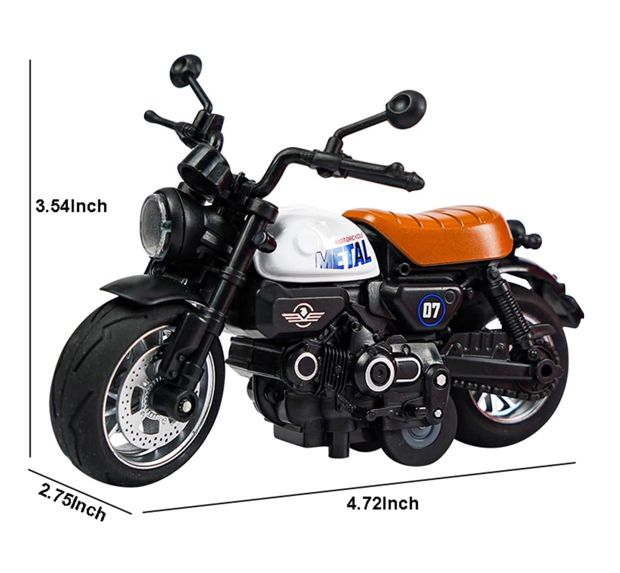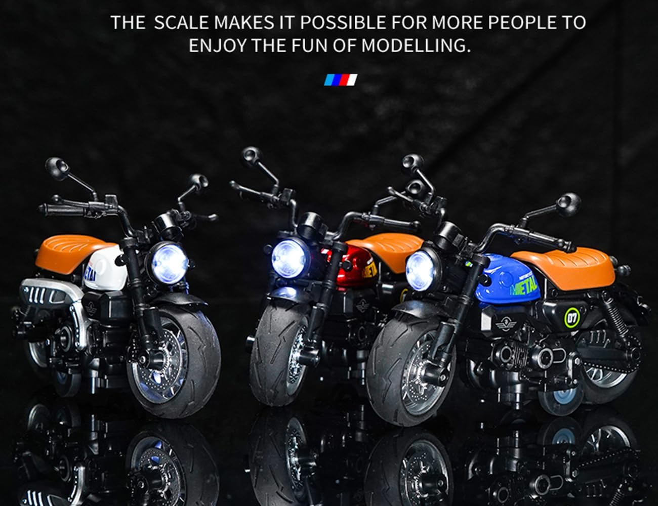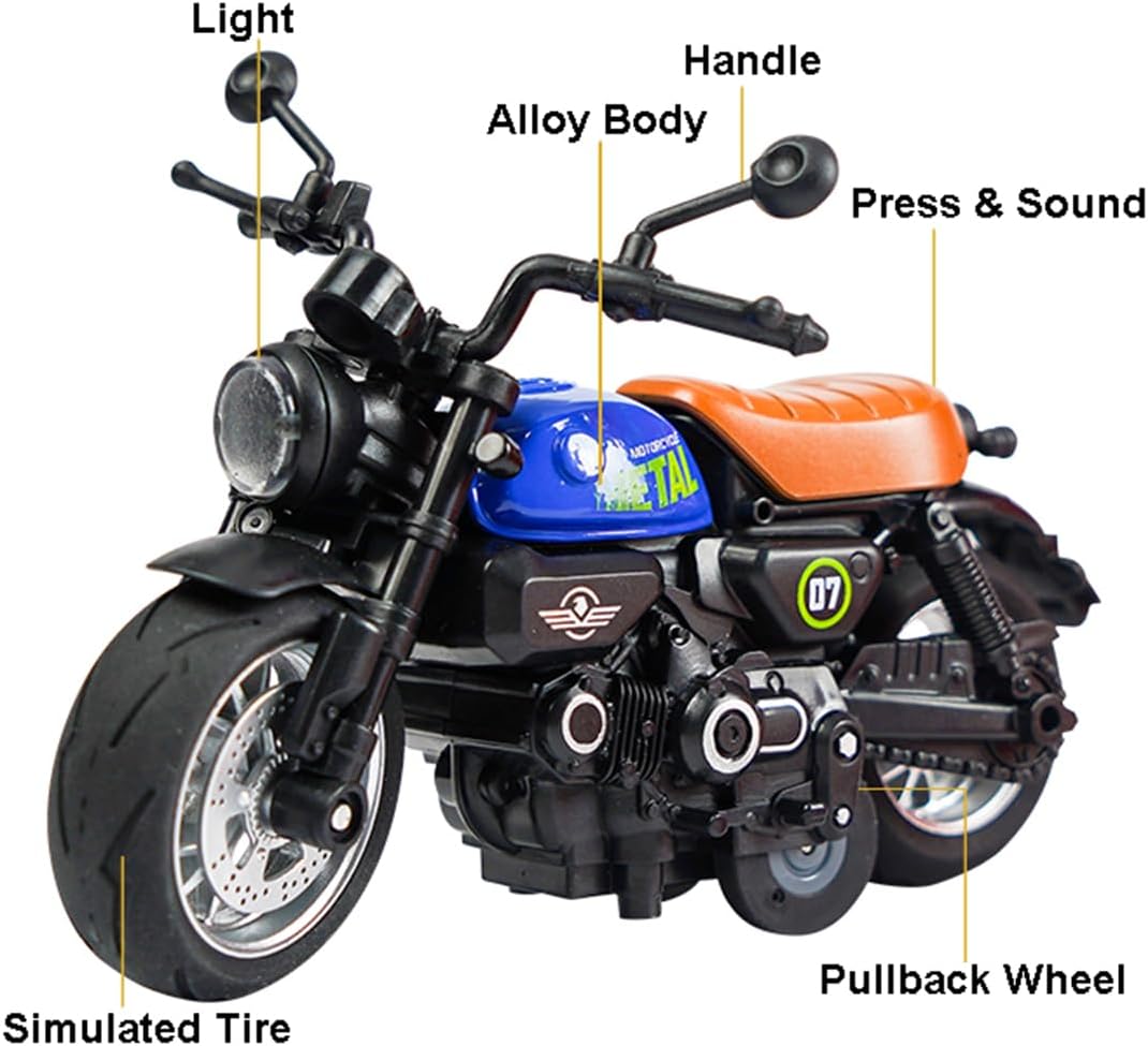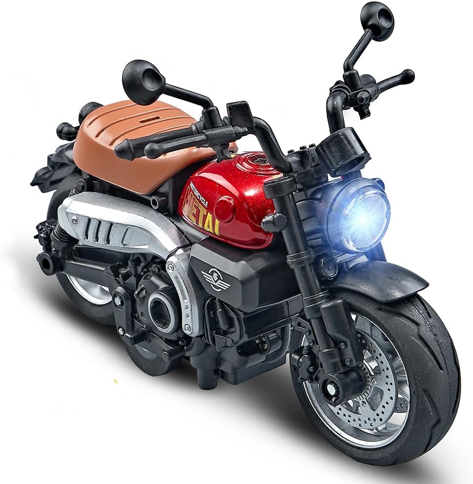 Motocicleta are o lungime de aproximativ 18 cm, fiind proporționată ideal pentru expunere sau joacă activă. Analizând funcționalitatea, acest model interactiv surprinde prin realismul său: la apăsarea roții din spate sau a ghidonului, vehiculul activează sunete specifice de motor ambalat și aprinde farurile cu LED, simulând pornirea unei motociclete reale. Dotată cu un mecanism de tip „Pull-Back”, motocicleta poate parcurge distanțe considerabile pe suprafețe plane dintr-o singură mișcare de retracție. Disponibilă în 3 tipuri de design clasic (Cruiser, Chopper sau Sport Classic), fiecare variantă dispune de ghidon mobil și cric funcțional, oferind o experiență completă de manipulare și expunere.