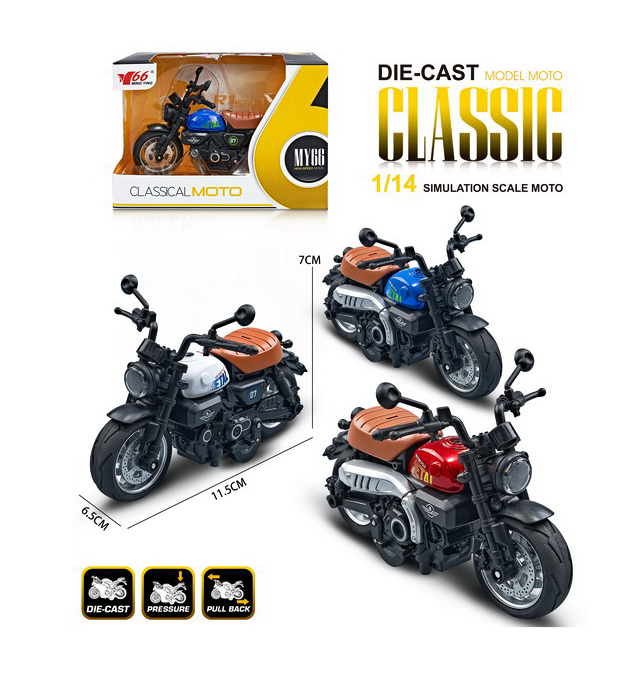 Adăugați o notă de stil și putere colecției dumneavoastră cu această motocicletă Classical din metal, o replică de excepție care omagiază designul legendar al vehiculelor pe două roți. Realizată cu o atenție meticuloasă la detalii, această miniatură die-cast combină robustețea aliajului metalic cu finisajele premium, fiind o piesă dorită atât de micii pasionați de viteză, cât și de colecționarii rafinați. Structura sa solidă și detaliile mecanice vizibile oferă un aspect autentic, gata să cucerească orice „șosea” imaginară.